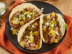 Tres tacos con cerdo desmechado, trozos de piña, pico de gallo y cilantro, acompañados con limón.
