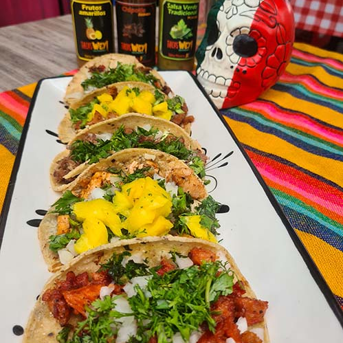 El sabor de México en tu mesa, tortillas de maíz nixtamalizado, con proteínas de elección, acompañadas de cebolla, cilantro y piña, son una experiencia auténtica mexicana.