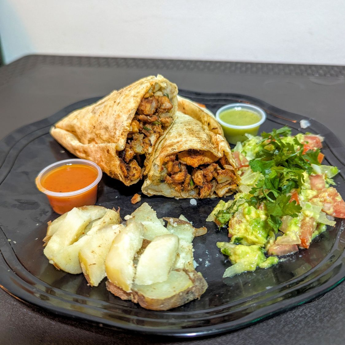 Bisteck de cerdo marinado, frijoles, pico de gallo y guacamole en tortilla XL. ¡Puro sabor en estéreo!