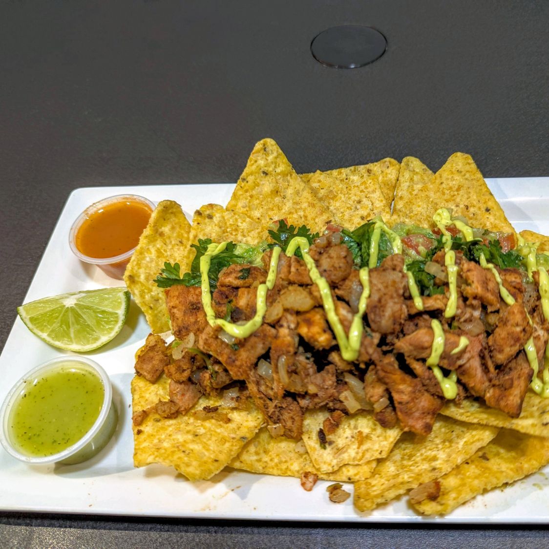 Una montaña de nachos con guacamole fresco y la carne que tú mandes. ¡Pa' picar y repetir!