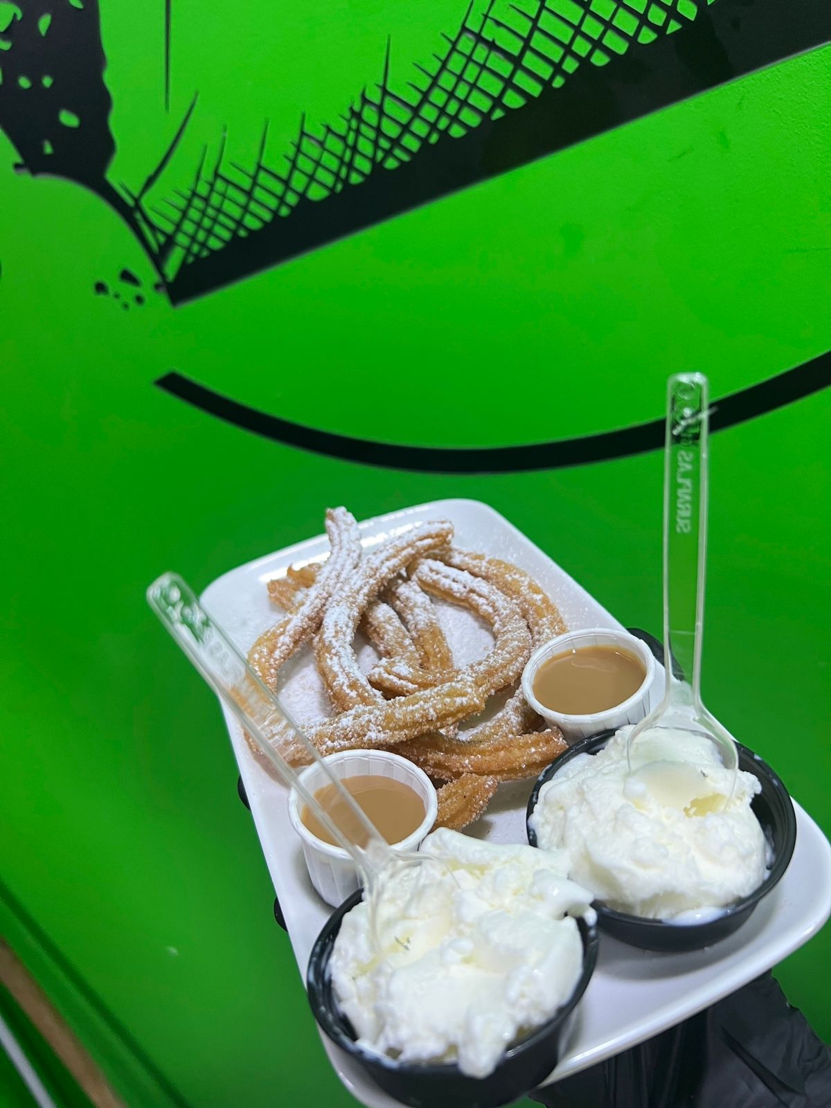 Cinco deliciosos churros cubiertos de azúcar en polvo, canela y bola de helado.