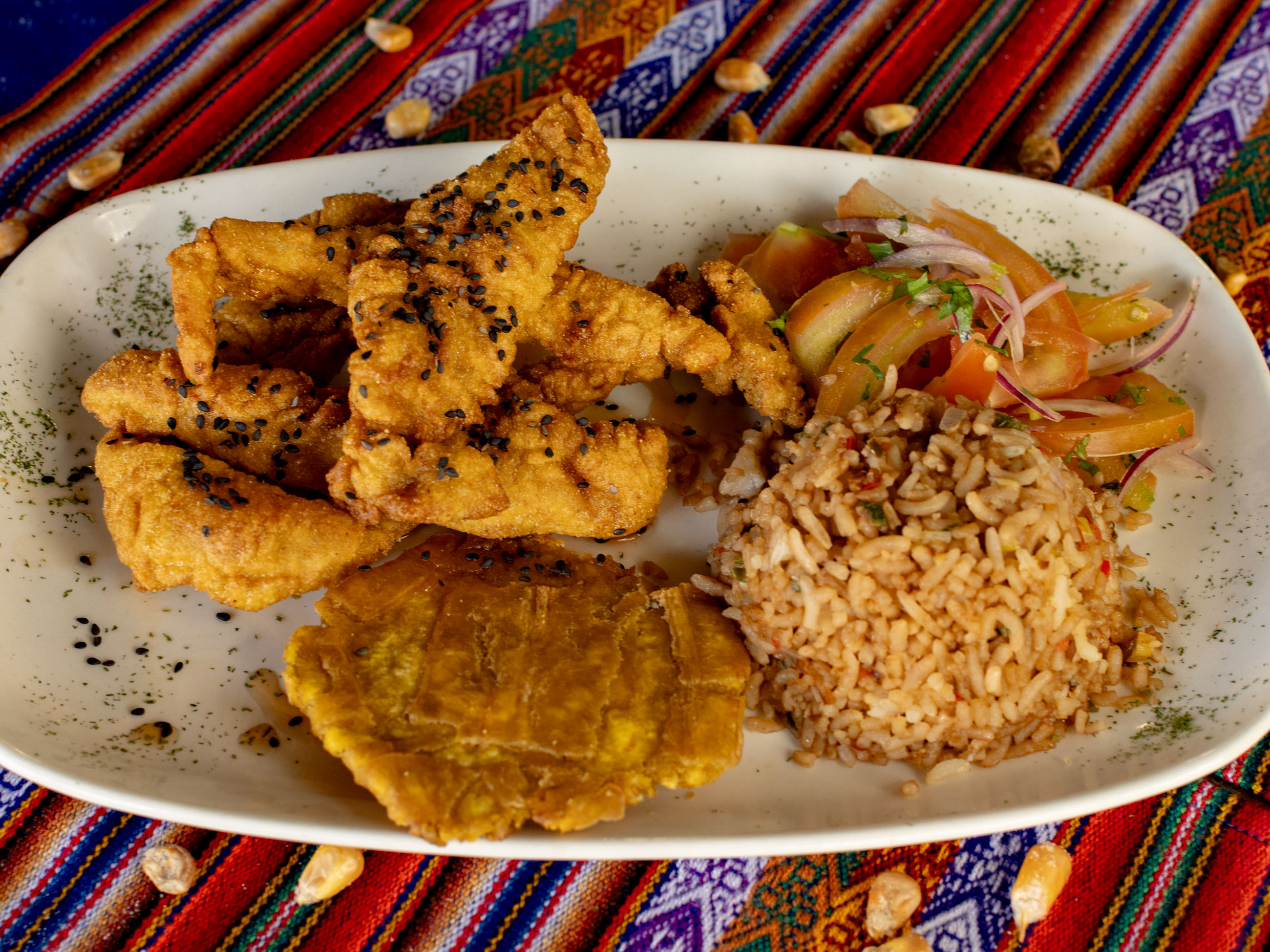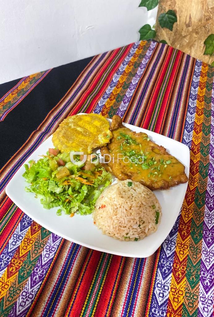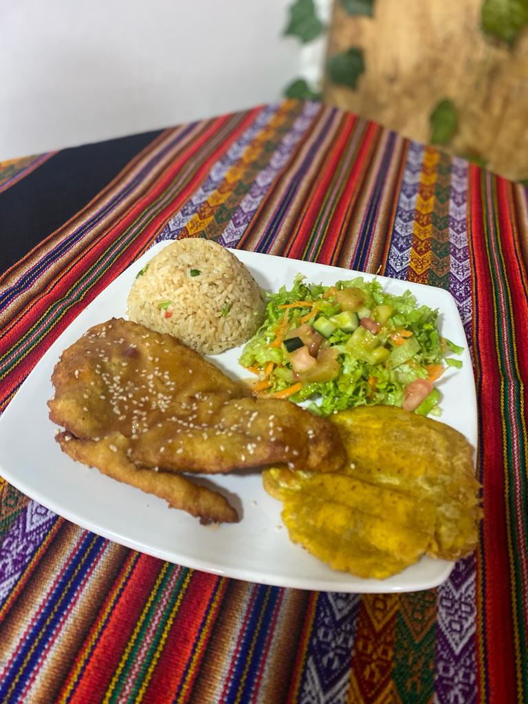 Filete Tilapia Apanado, Acompañado de Arroz Chaufa, Patacón, Ensalada + Consomé de Pescado.