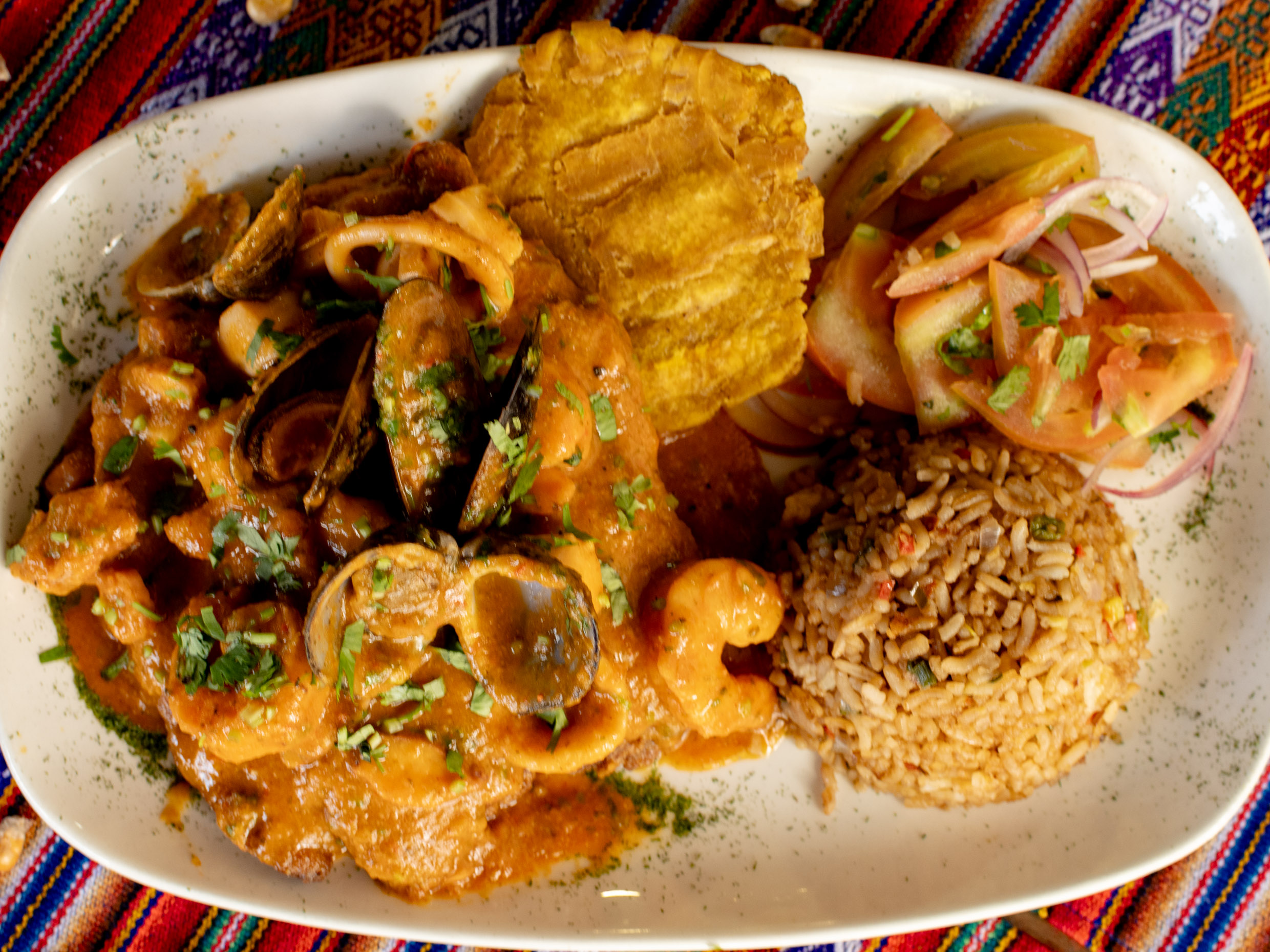 Trozos de Pescado y Mariscos, Acevichados con Cebolla, Cilantro y especias Peruanas. Acompañado de Patacones.