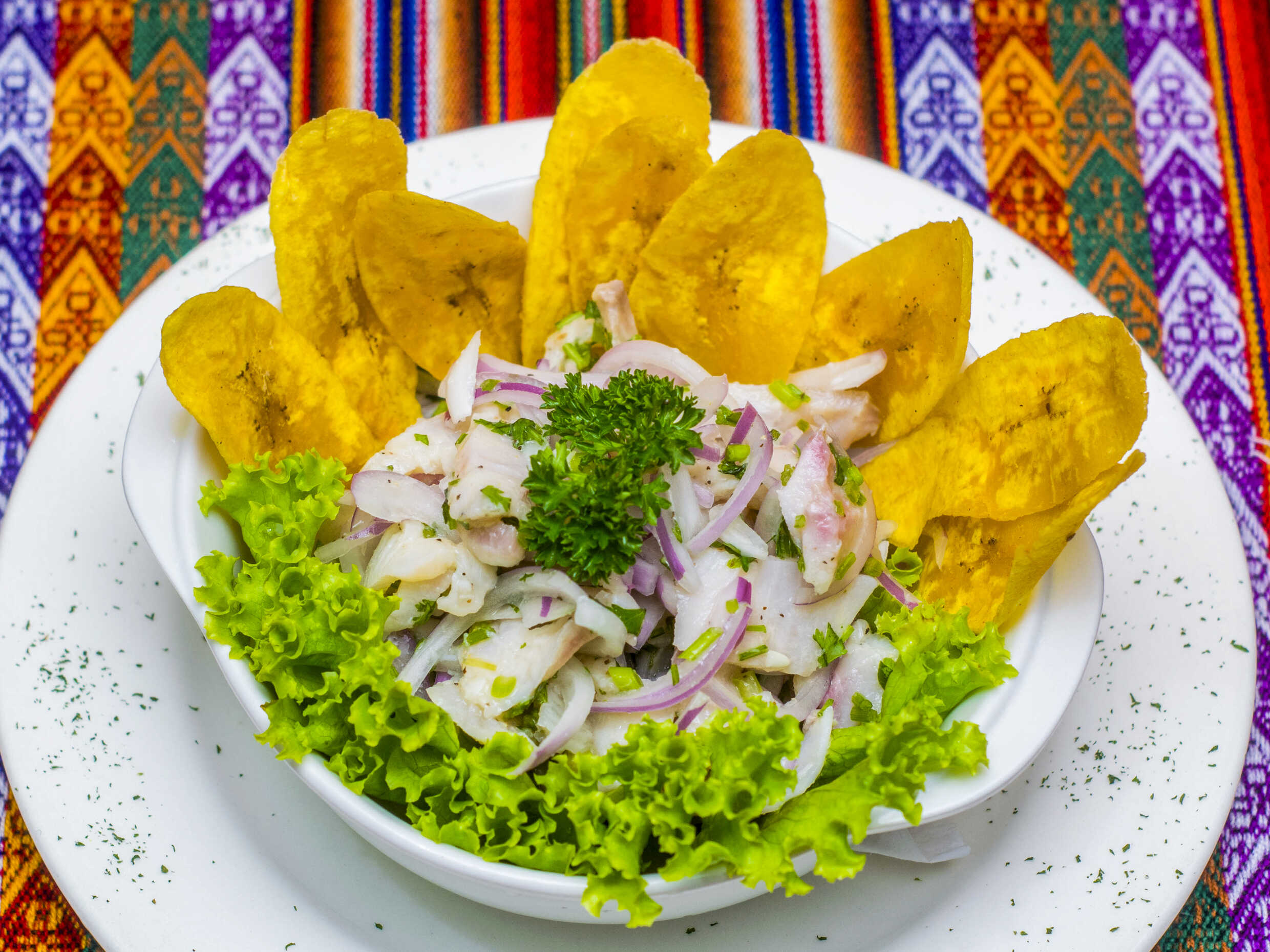 200 g de trozos de pescado y 100 g de camarones acevichados con cebolla y cilantro, acompañados con patacones.