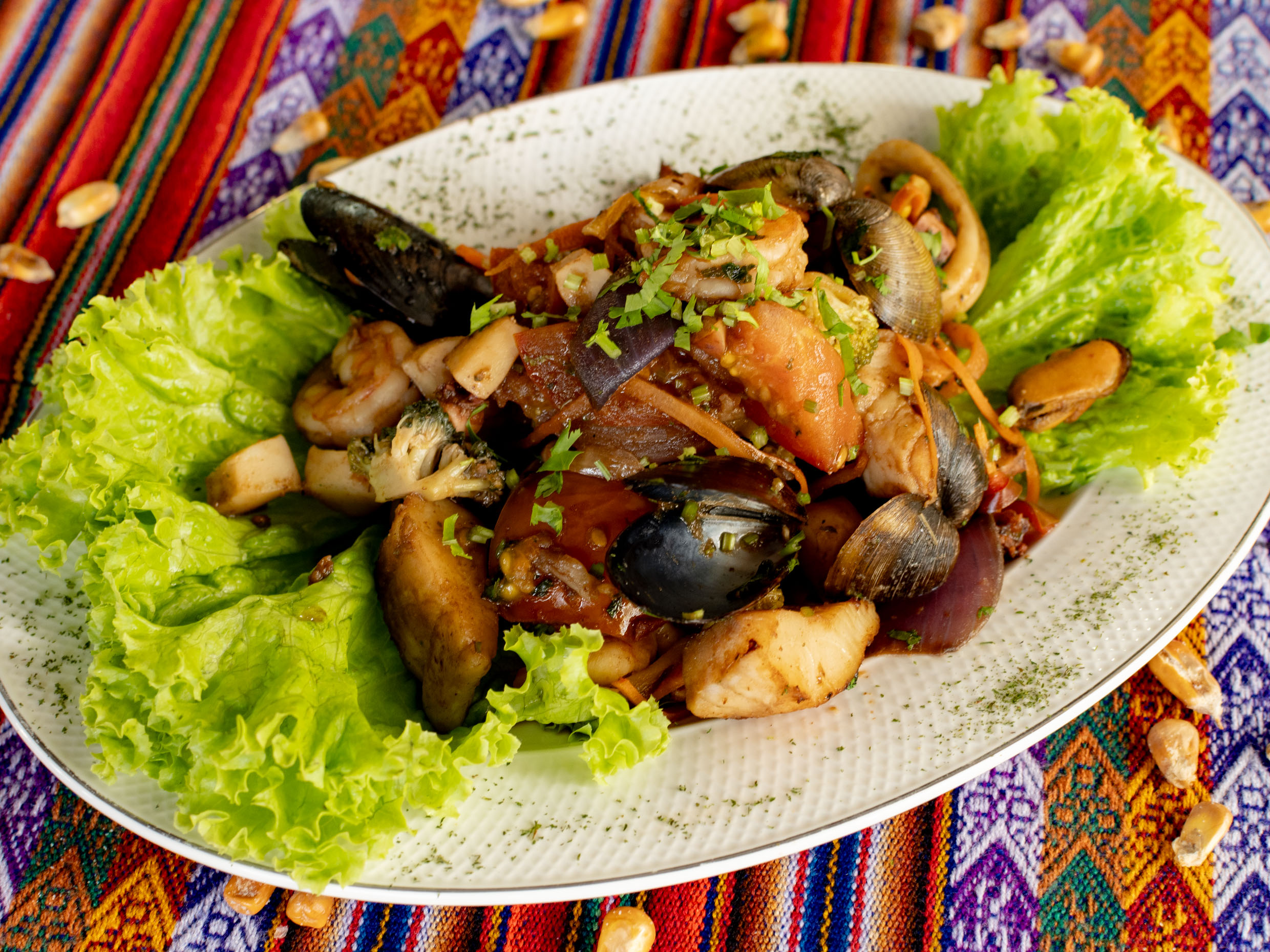 Salteado de vegetales y Mariscos frescos en salsa de soya.
