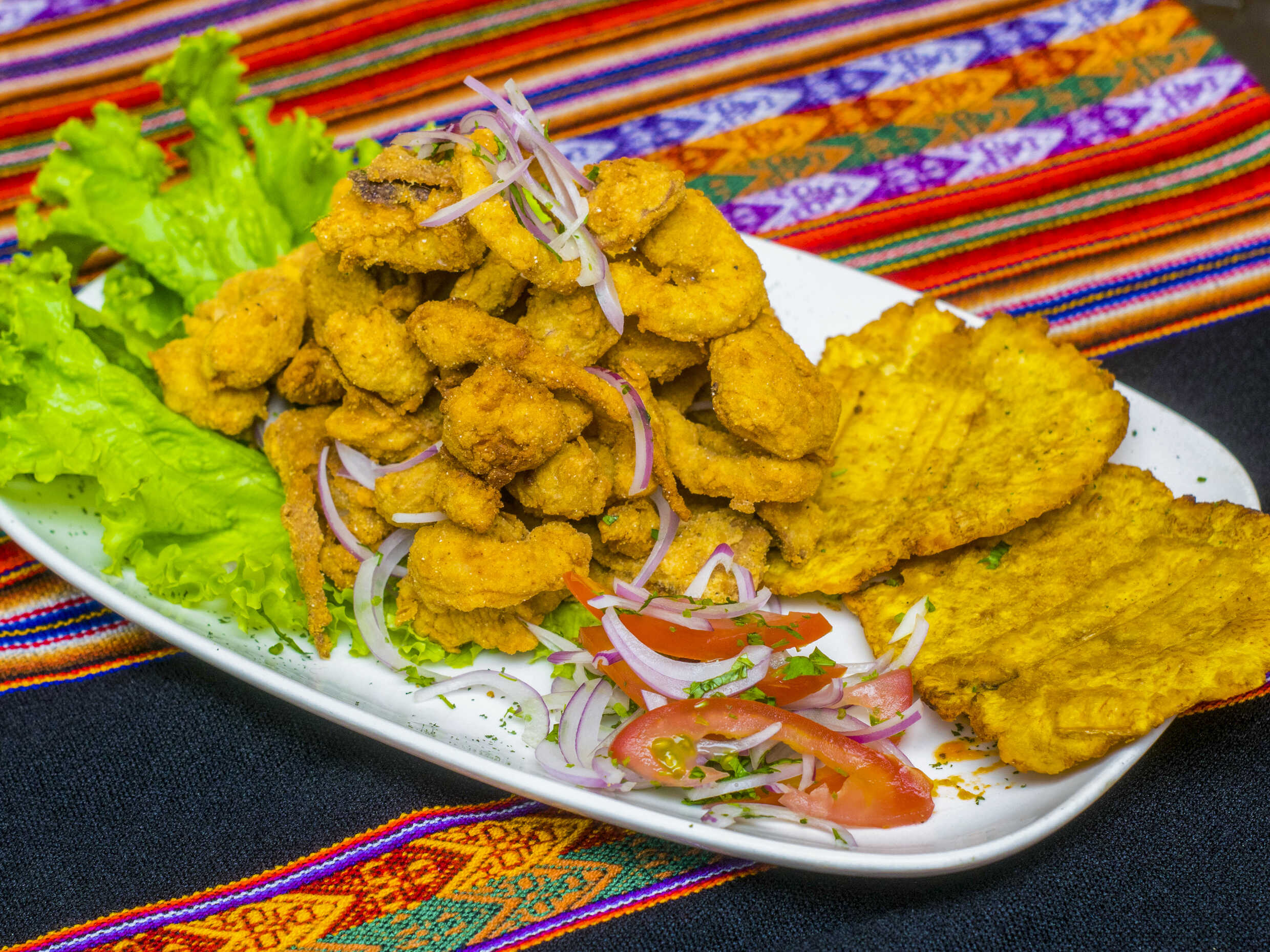 Pescado y Mixto de Mariscos apanados crocantes, acevichados. Acompañado de Patacones.
