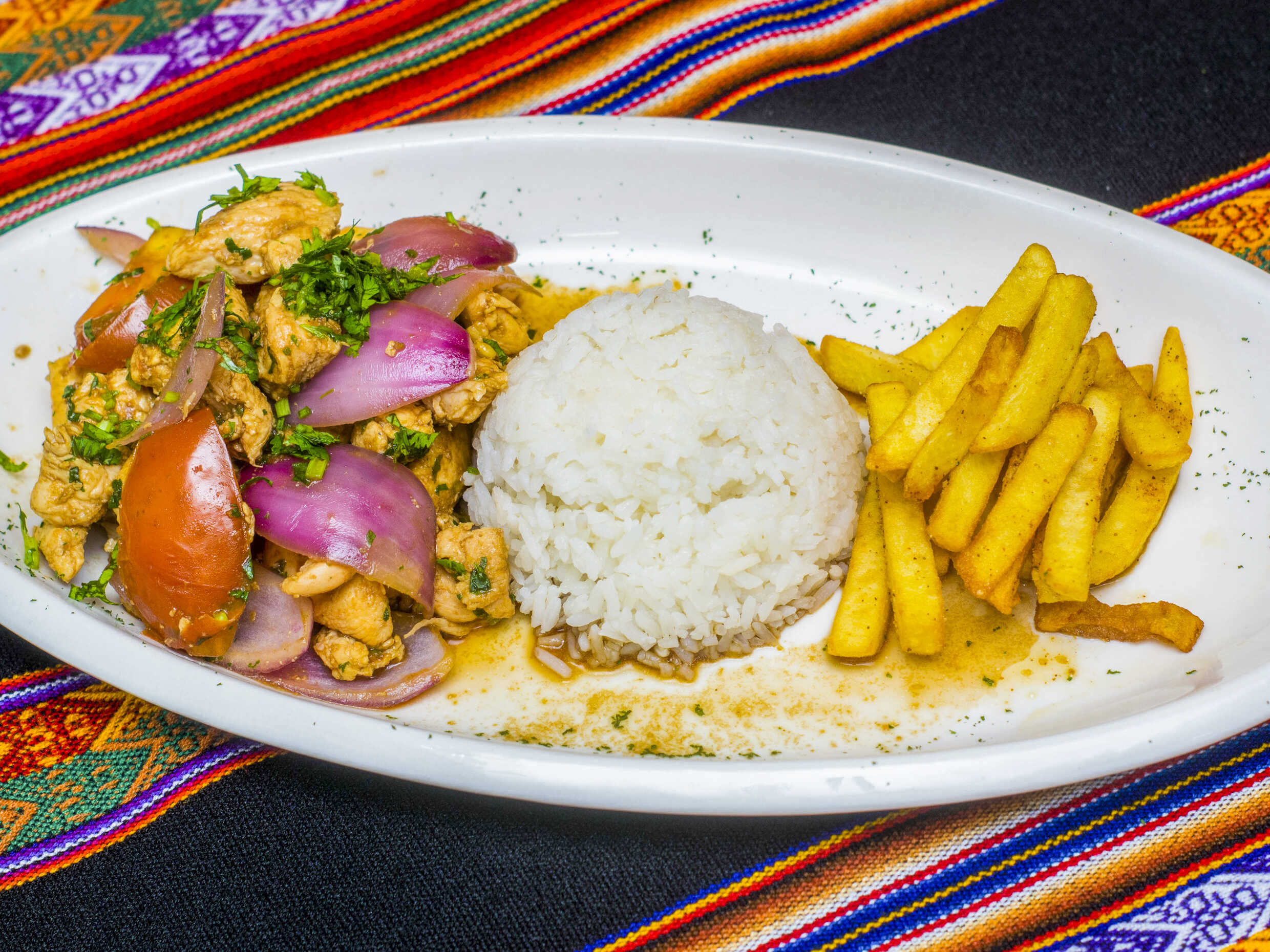 Pechuga saltada al wok con Vegetales y Especias Peruanas, Acompañada de arroz blanco y papas fritas.