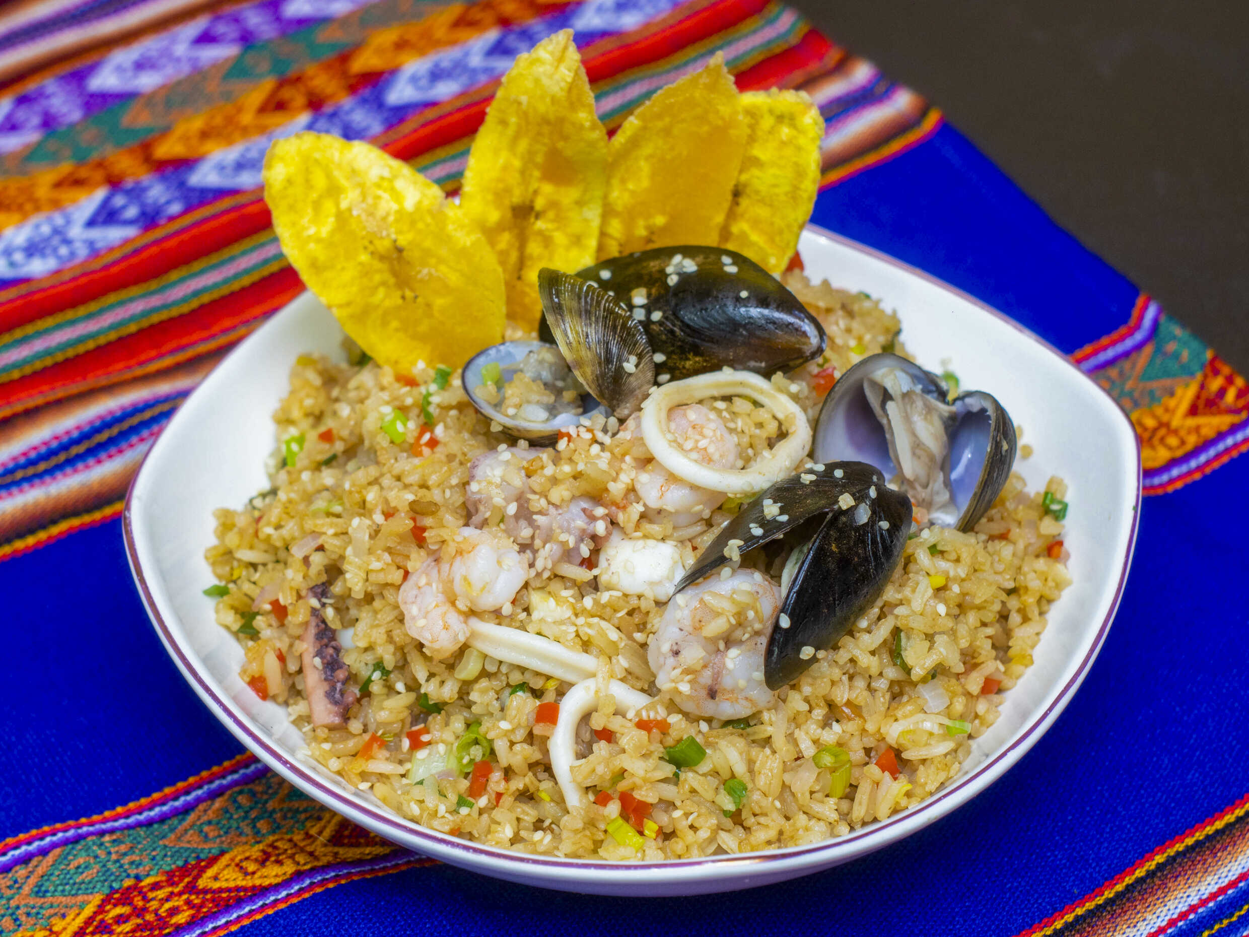 Auténtico Arroz Chaufa peruano con Camarones, Calamar, Pulpo y Mejillones.