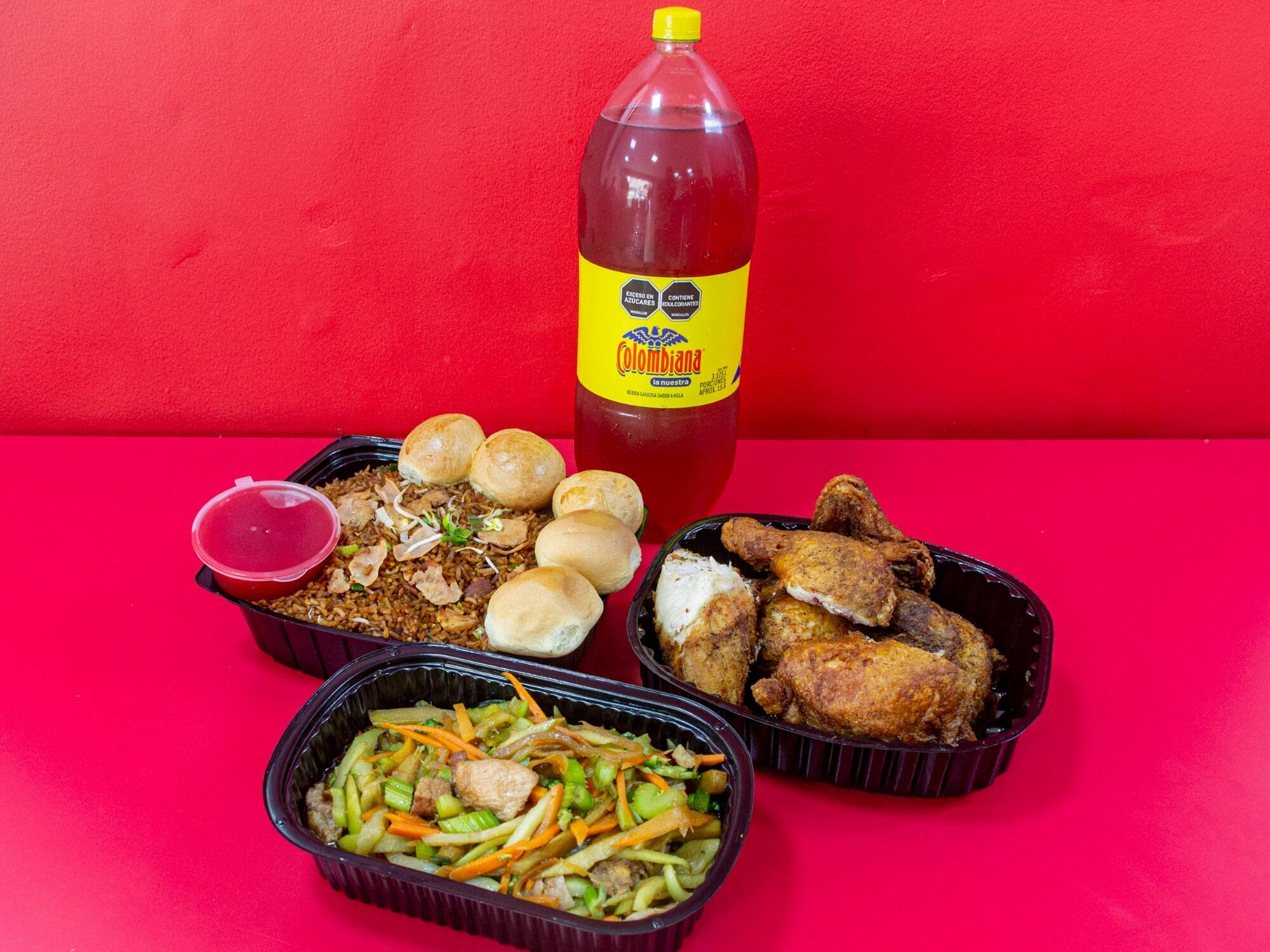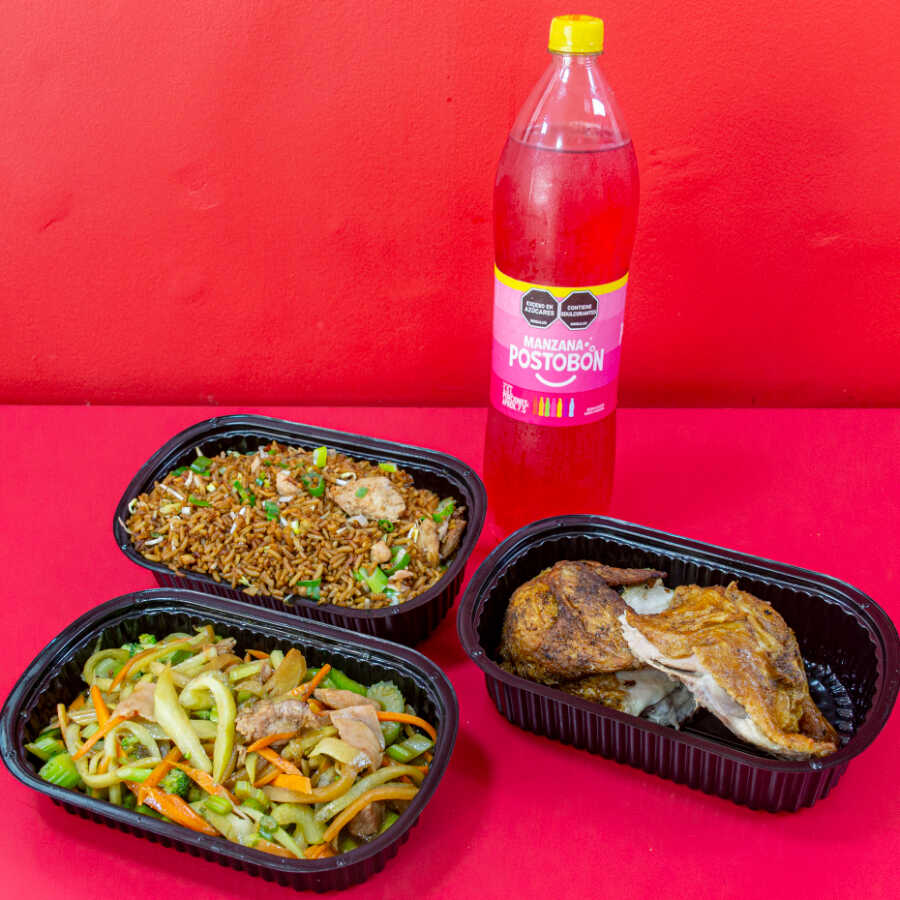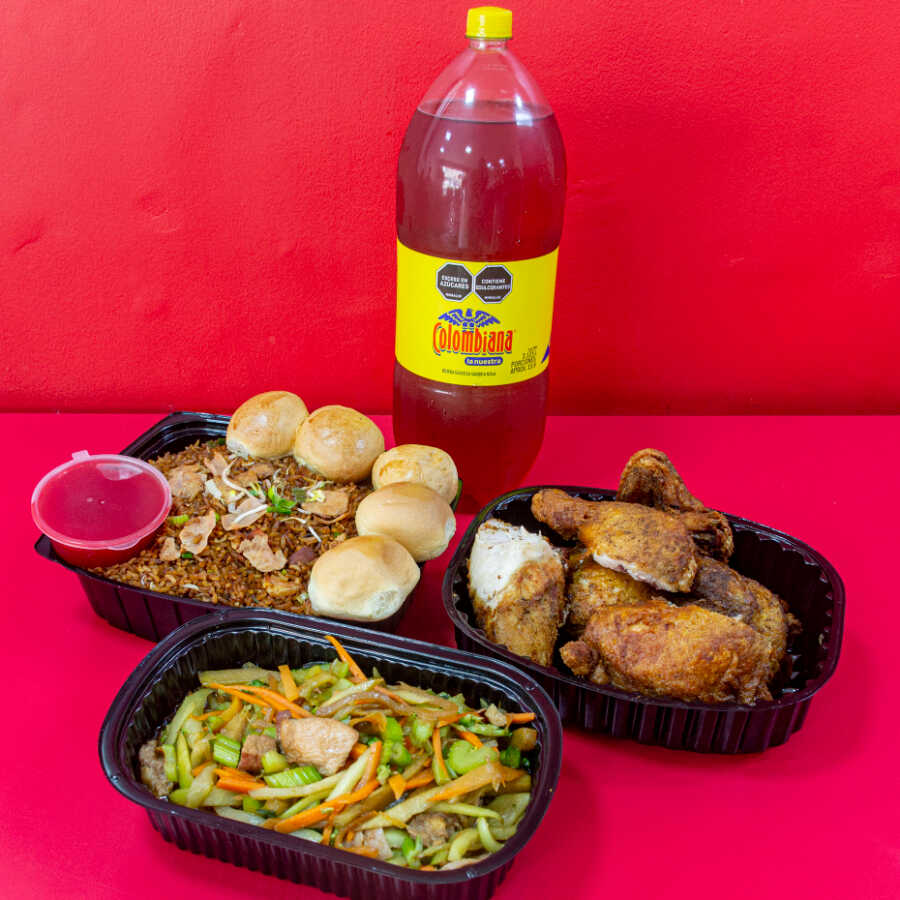 Combo arroz especial (pollo, cerdo y jamon) mediano + 1/2 pollo frito sin apanar + extra (chopsuey o espagueti) pequeño+ gaseosa 1.5l