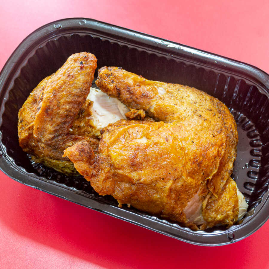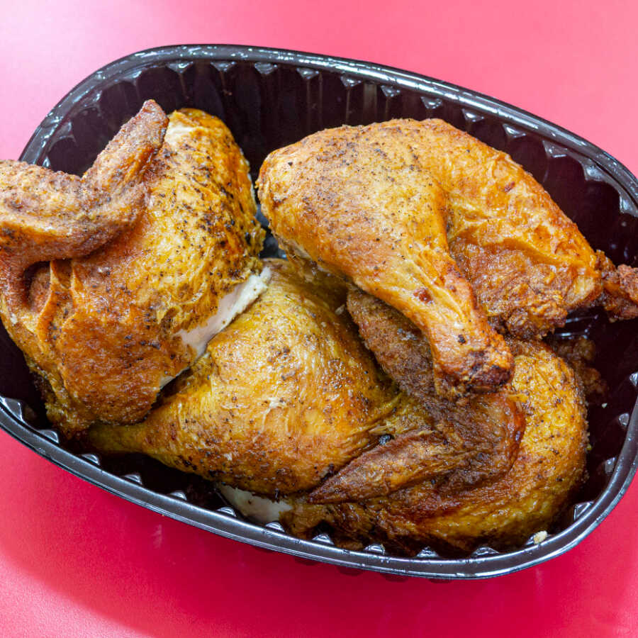 Una orden de 1/2 pollo frito sin apanar y 4 arepas para toda la familia.