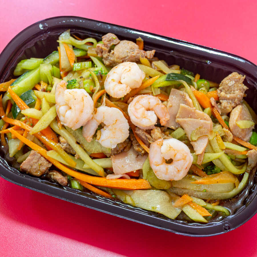 Vegetales, camarón, pollo, cerdo y jamón.