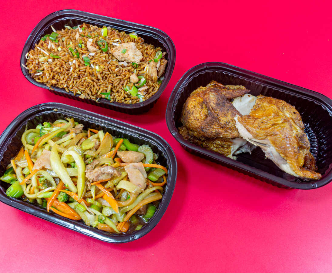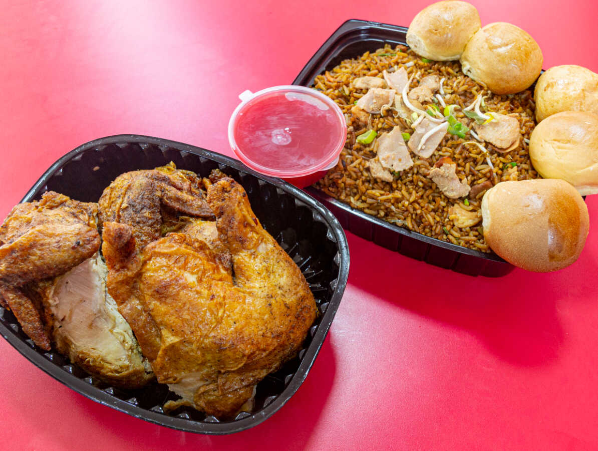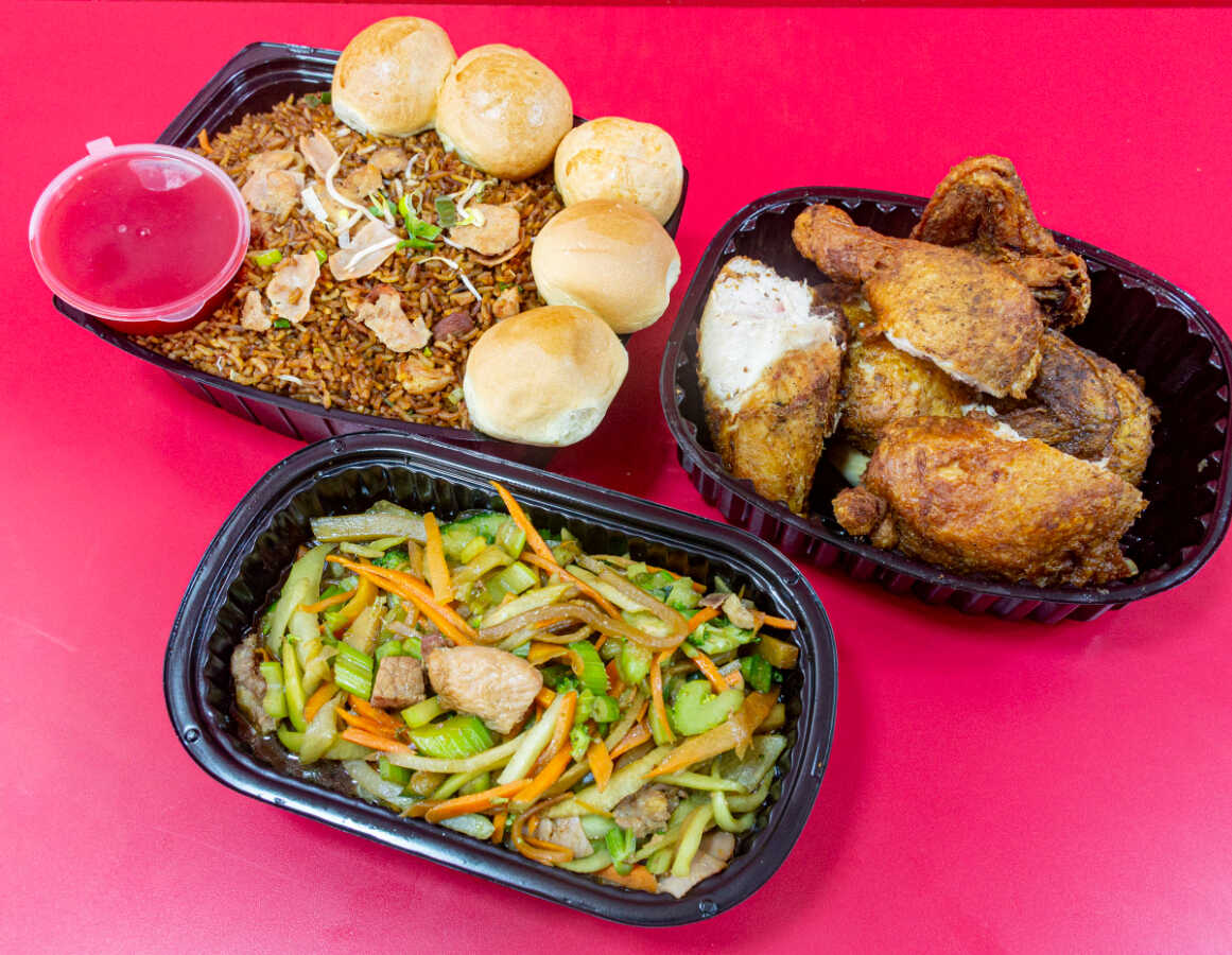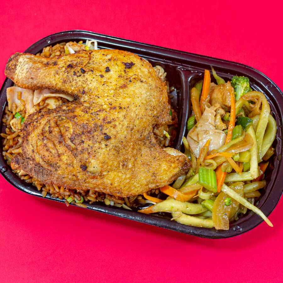 Combo arroz especial (pollo, cerdo, jamon) mediano+ 1/2 pollo frito sin apanar+ extra (chopsuey o espagueti) pequeño