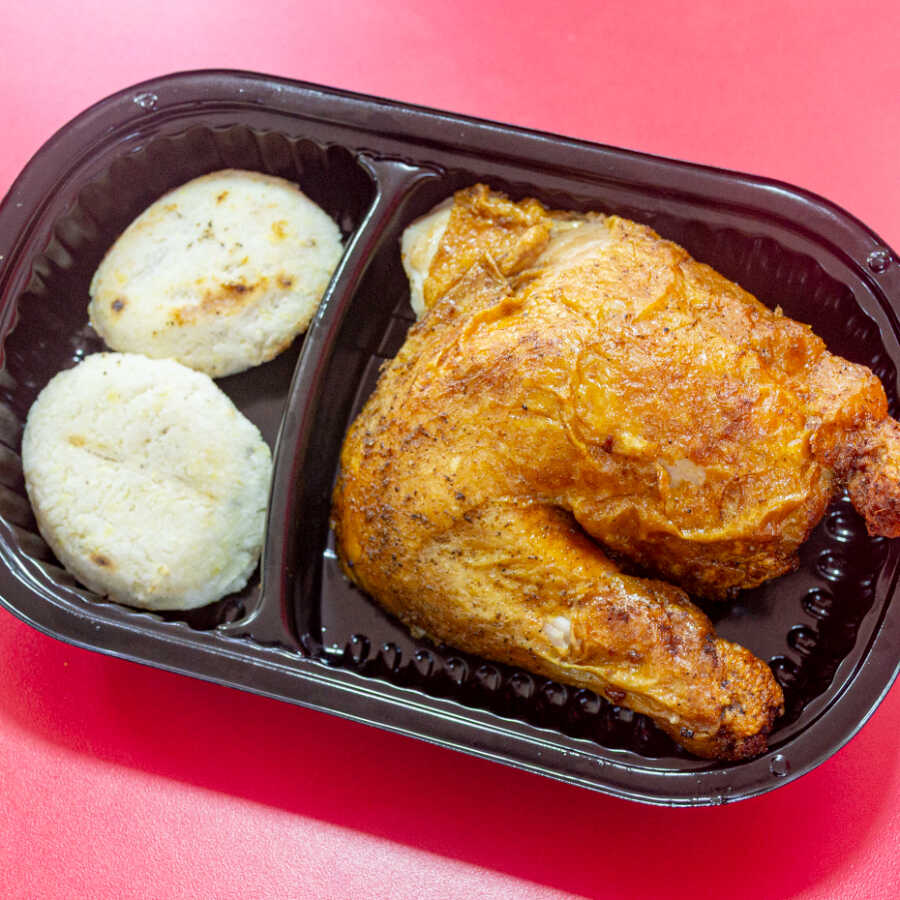 Una orden de 1/4 pollo frito y 2 arepas para acompañar tu día.