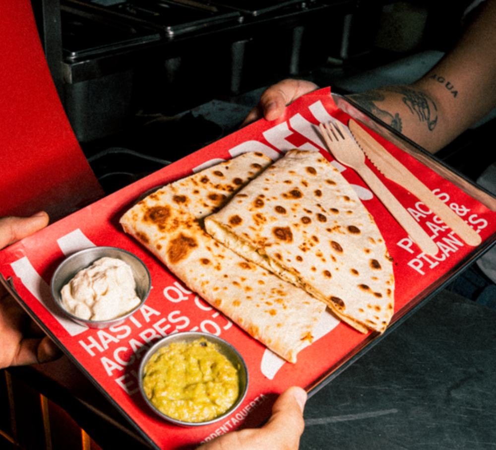 Quesadilla con mix de doble queso, cilantro, acompañado de sour cream y guacamole