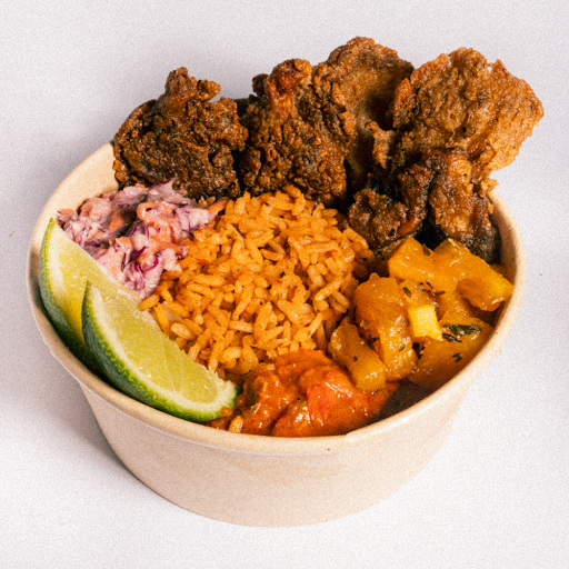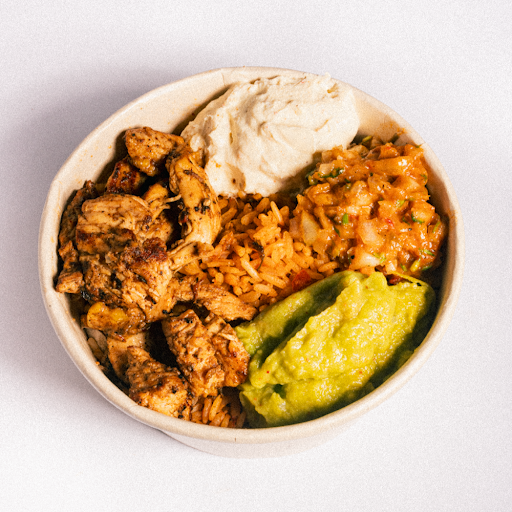 Bowl con base de arroz, pollo a la plancha, fríjoles, pico de gallo, guacamole, y salsa taquera.