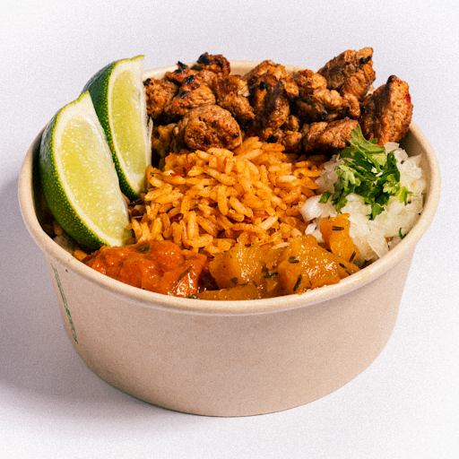 Bowl con base de arroz, cerdo al pastor, fríjoles, pico de gallo, guacamole, y salsa taquera.