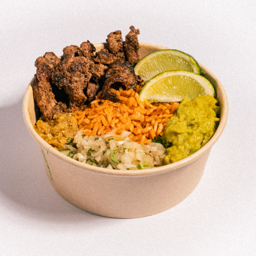 Bowl con base de arroz, arrachera a la plancha, fríjoles, pico de gallo, guacamole, y salsa taquera.