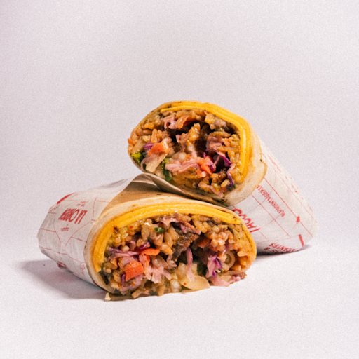 Tortilla de trigo rellena de cerdo al pastor, arroz rojo poblano, fríjol refrito, queso cheddar, piña oro miel y picadillo fresco