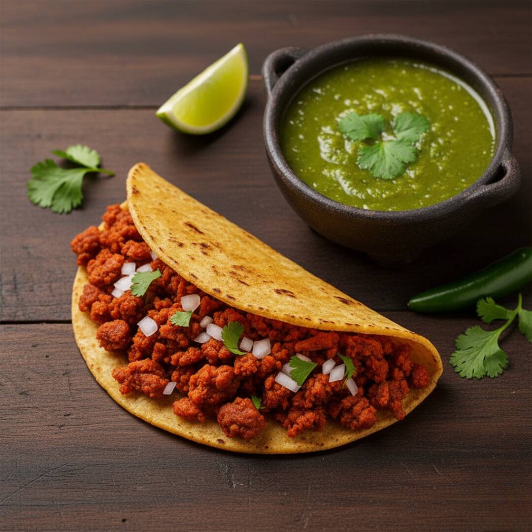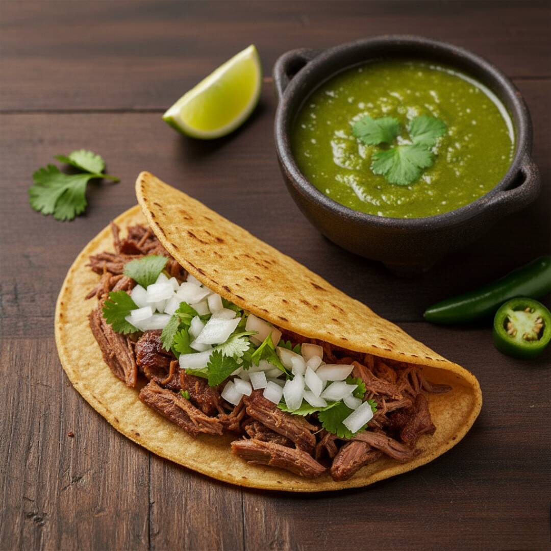 Tortilla de maíz rellena de Birria (Res), cebolla, cilantro.