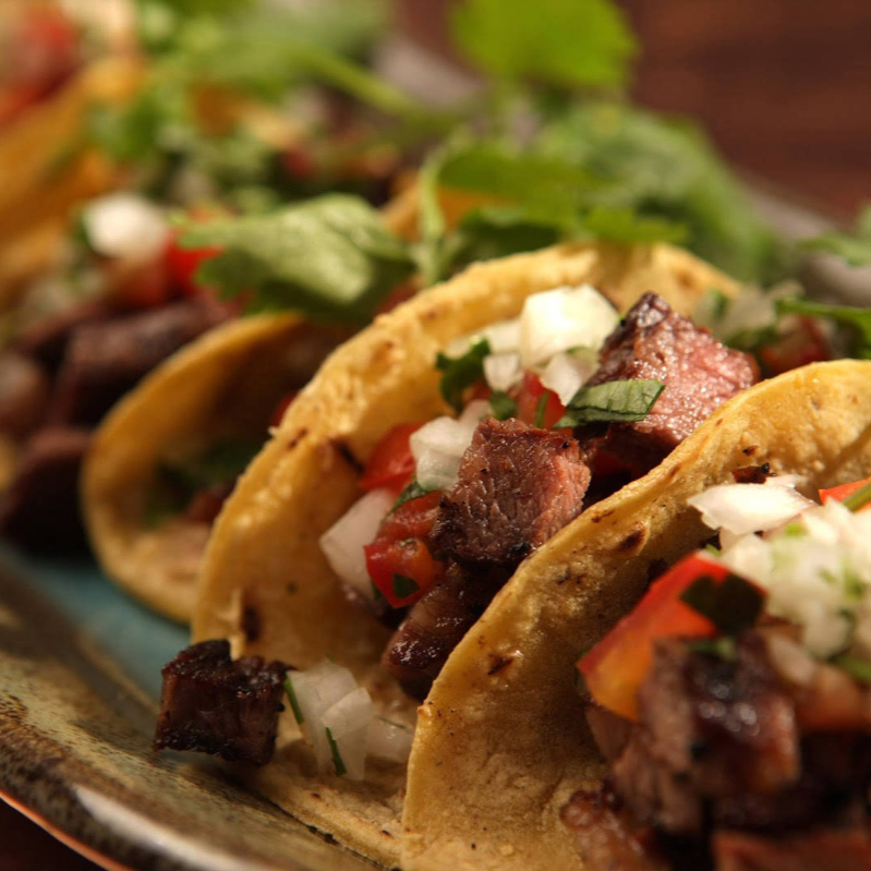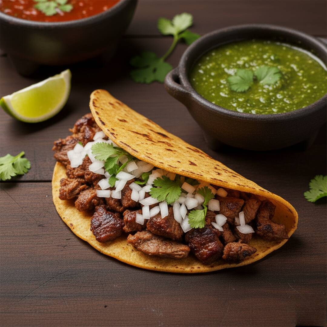 Tortilla de maíz, rellena de carne de res, cebolla, cilantro y salsa de la casa.