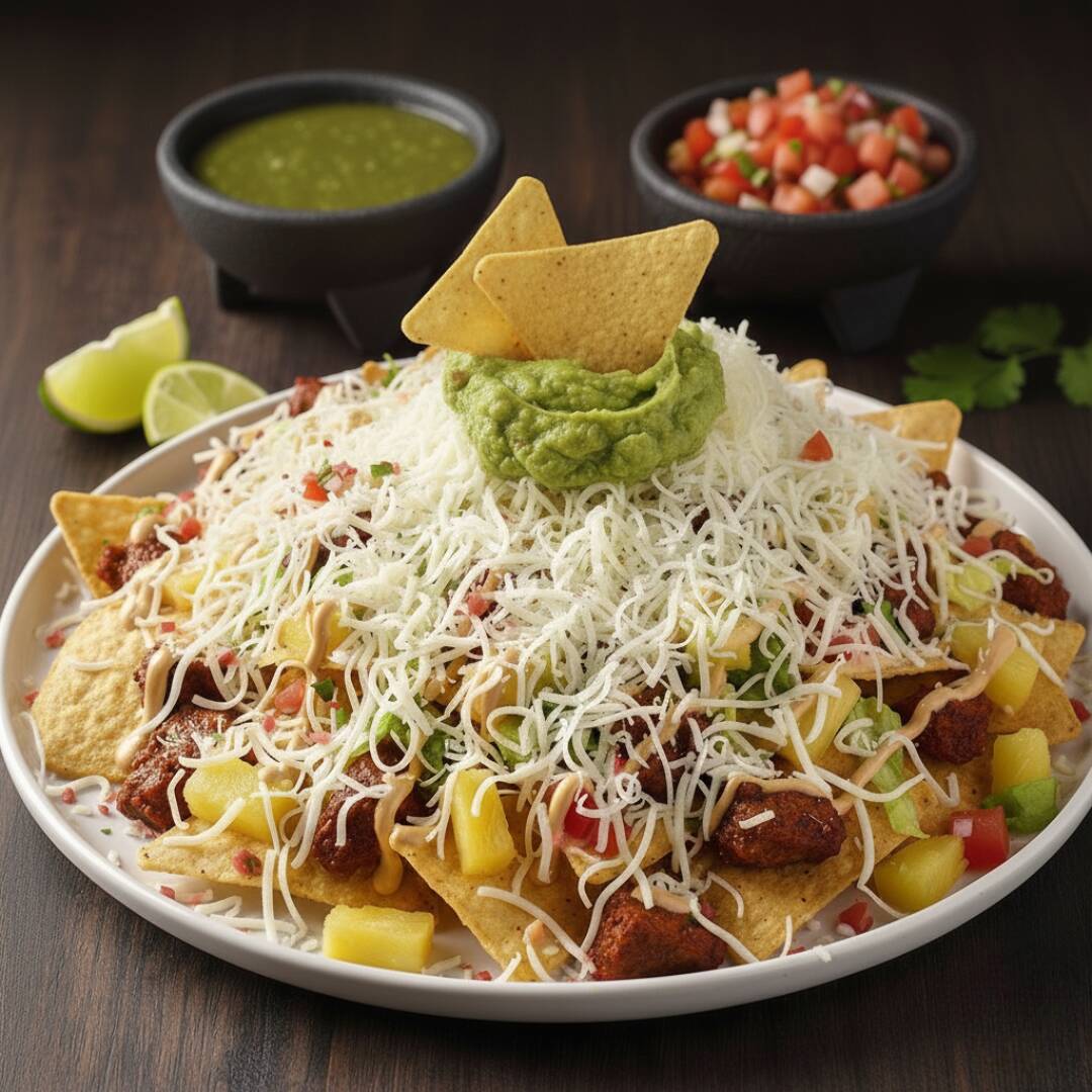Totopos con carne de Cerdo al Pastor, Sour cream, lechuga, mayochipotle, pico de gallo, guacamole y queso mozzarella rayado.