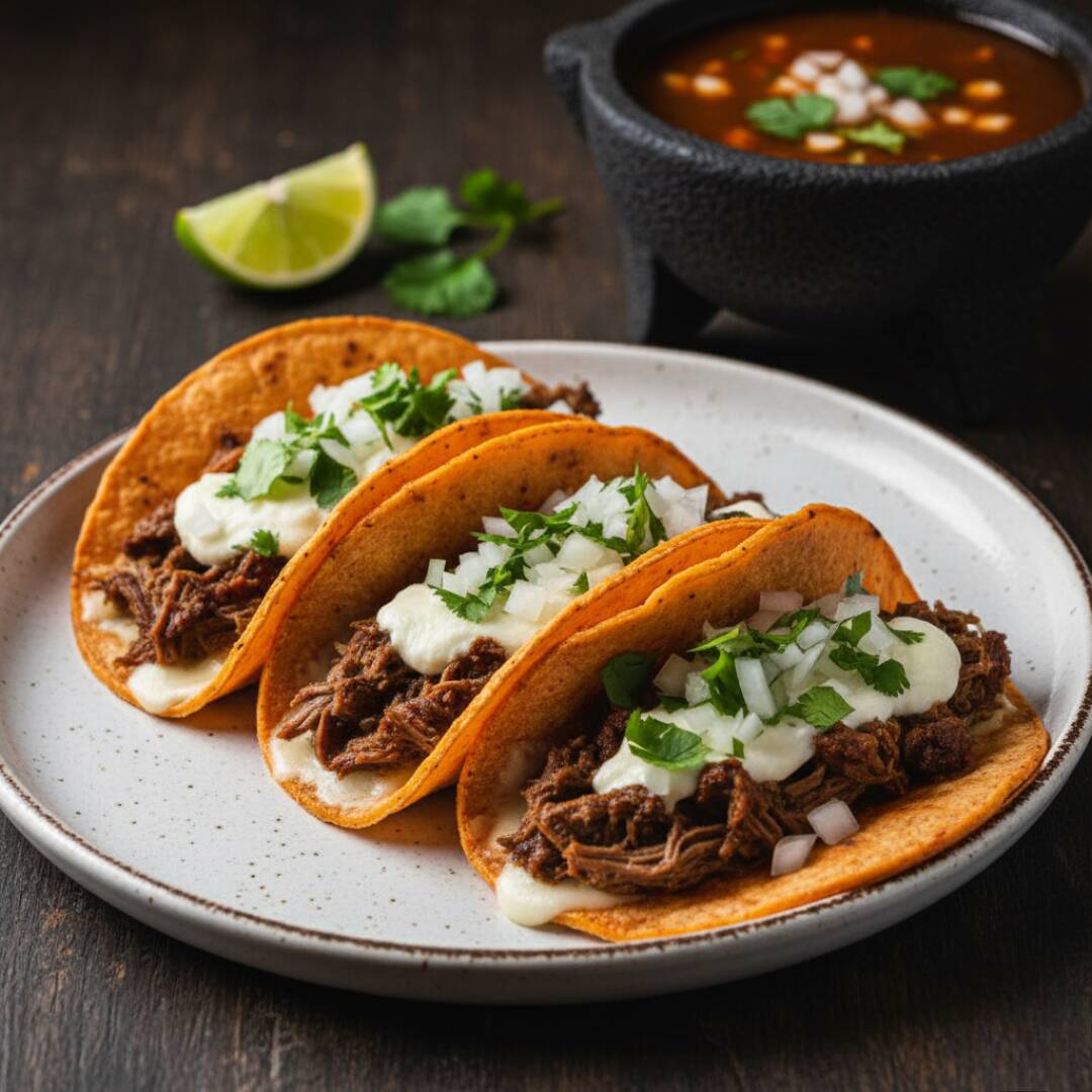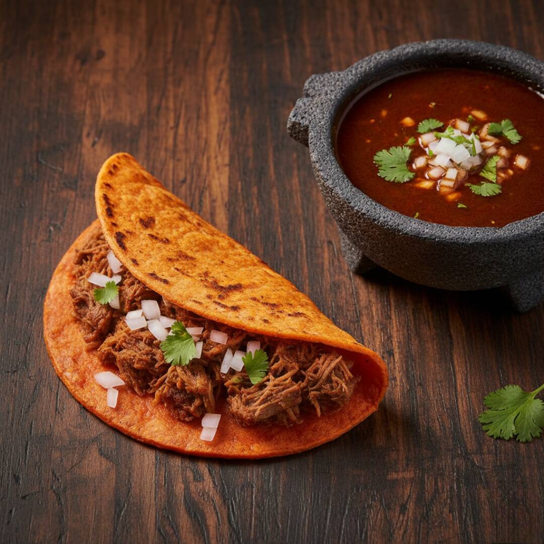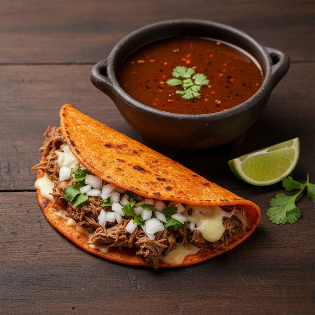 Tortilla de maiz a la plancha con queso gratinado, rellena de Birria (Res), cebolla, cilantro. Acompañada de consomé.