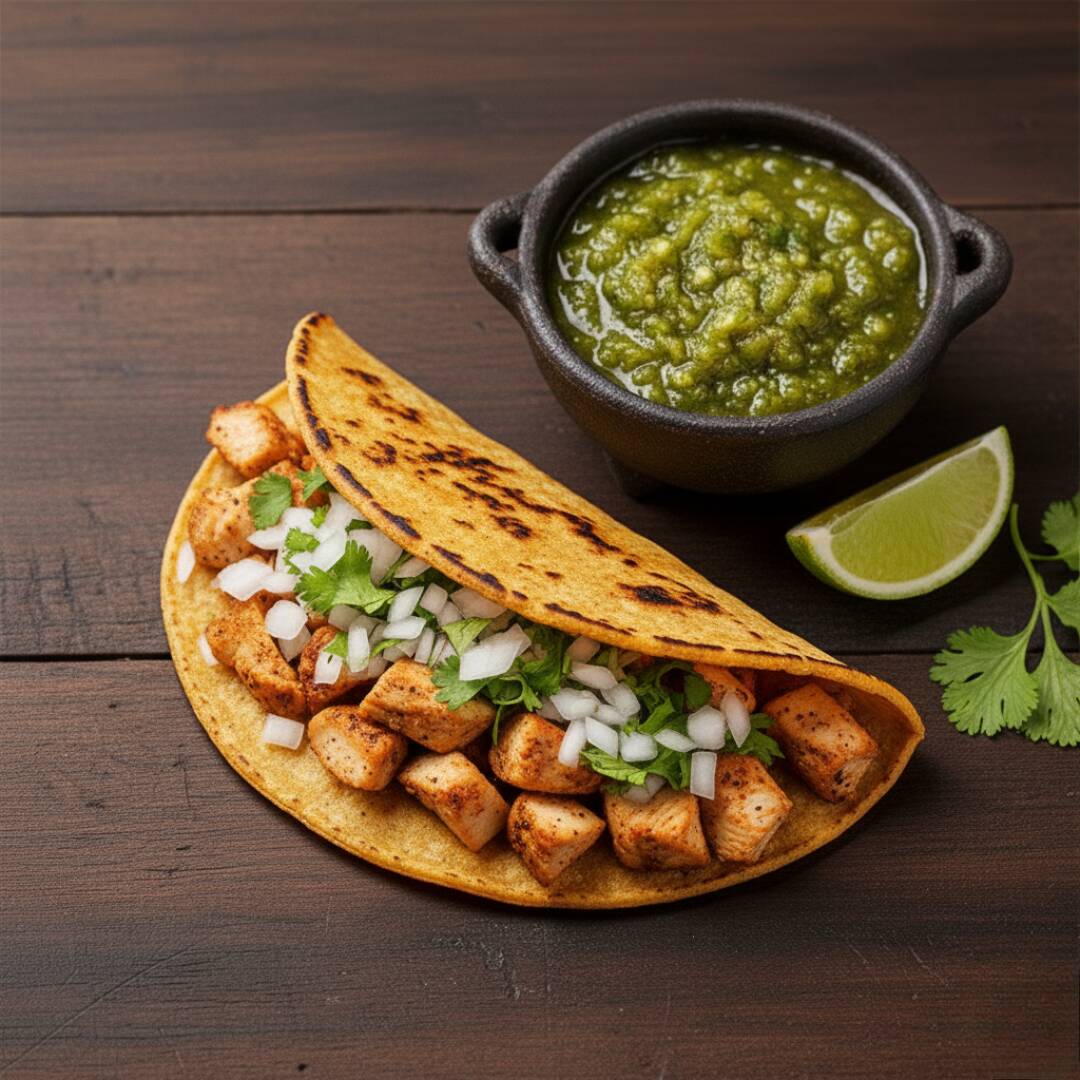 Tortilla de maíz rellena de Pollo salteado a la plancha, cebolla, cilantro y salsa de la casa.