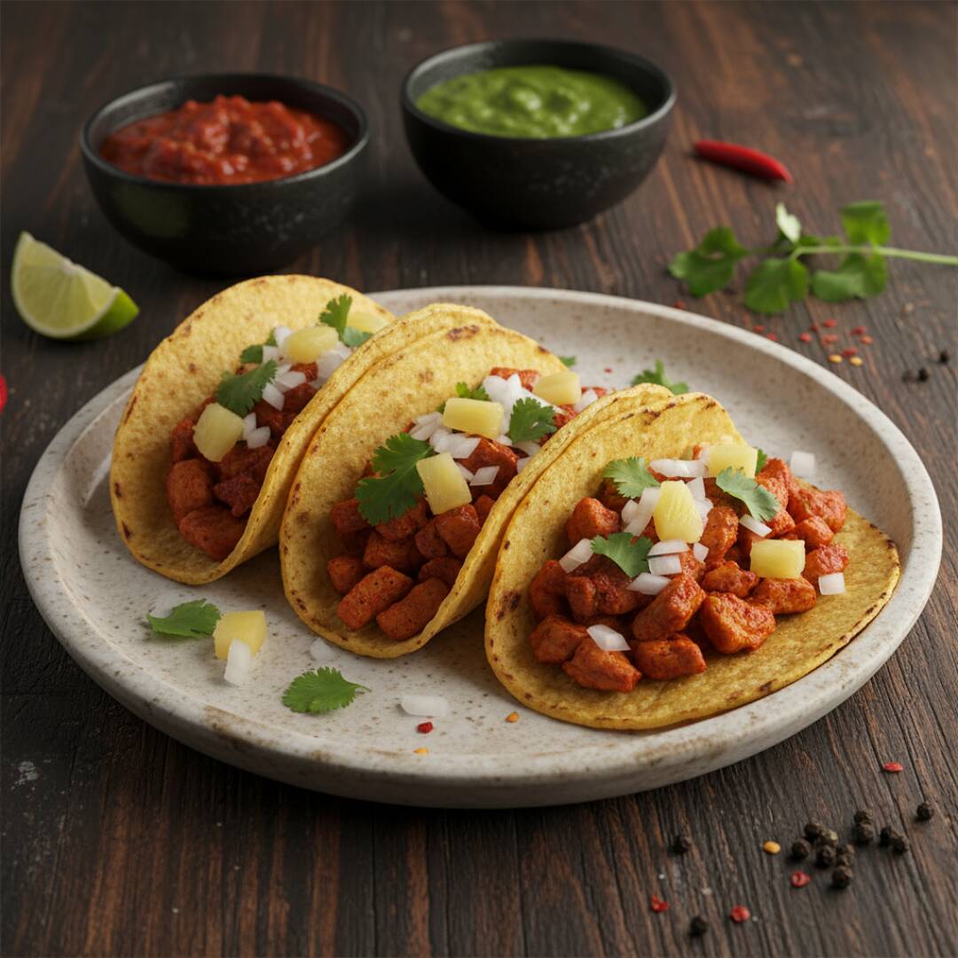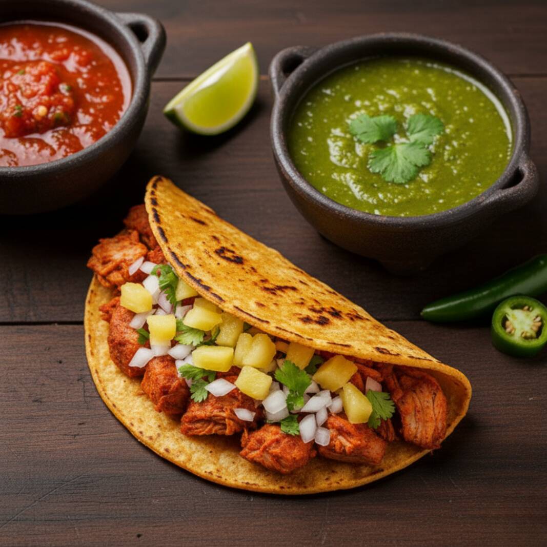 Deliciosa carne de Cerdo al Pastor con trozos de piña, cebolla, cilantro y salsa de la casa.