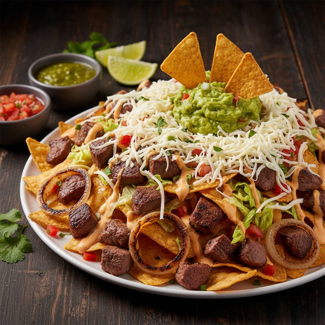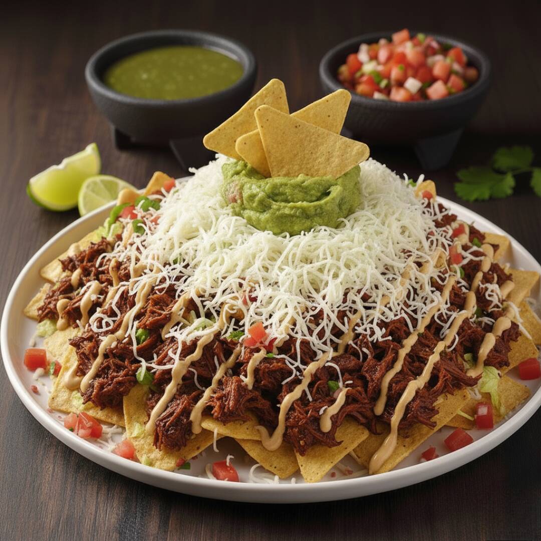 Totopos con carne de Birria (Res), Sour Cream, lechuga, mayochipotle, pico de gallo, guacamole y queso mozzarella rayado.