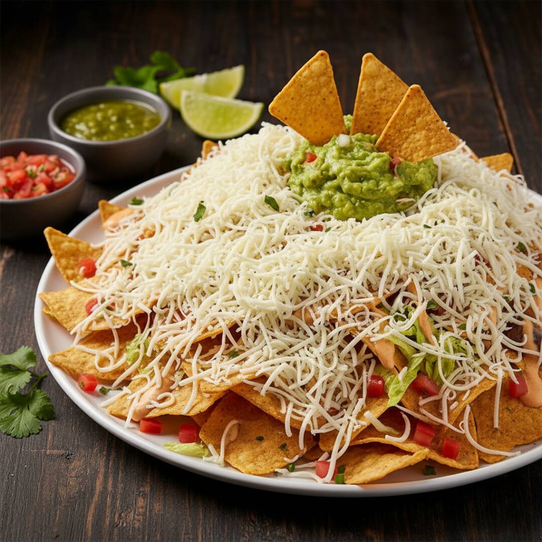 Totopos con Queso Mozzarella rayado, Sour Cream, pico de gallo, lechuga, mayochipotle y guacamole.