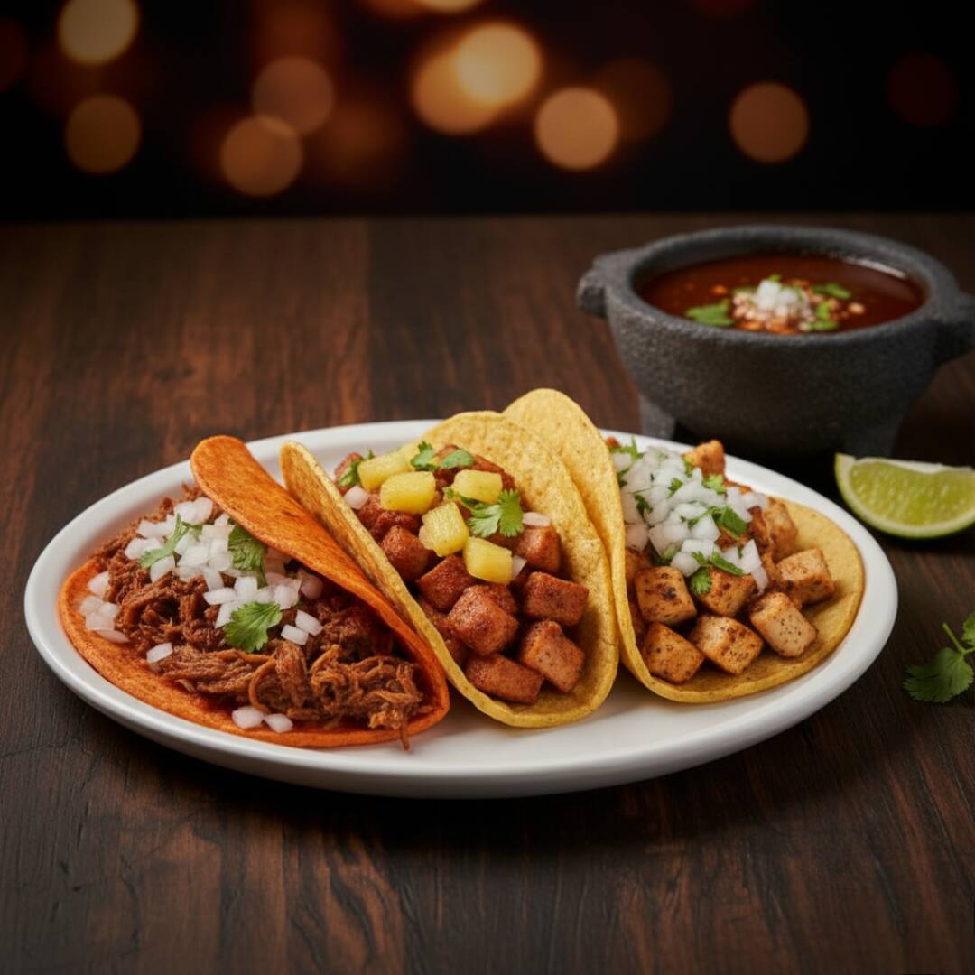 3 Tacos: Birria, Pastor y Pollo, cebolla, cilantro, acompañado de consomé de Birria. Incluye un agua de Horchata o Jamaica.