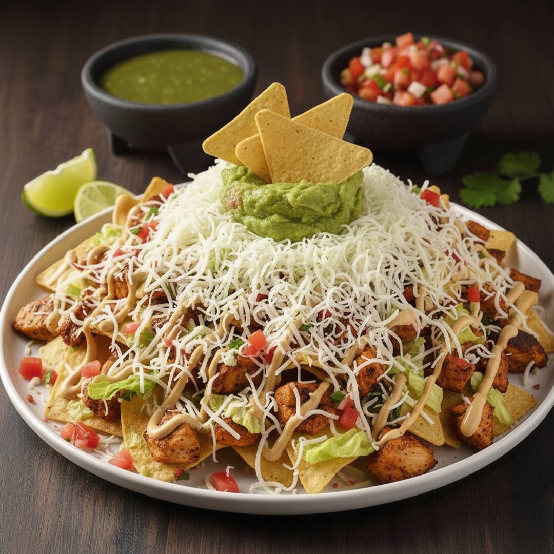 Totopos con cuadritos de Pollo asado a la plancha, Sour Cream, lechuga, mayochipotle, pico de gallo, guacamole y queso mozzarella rayado.