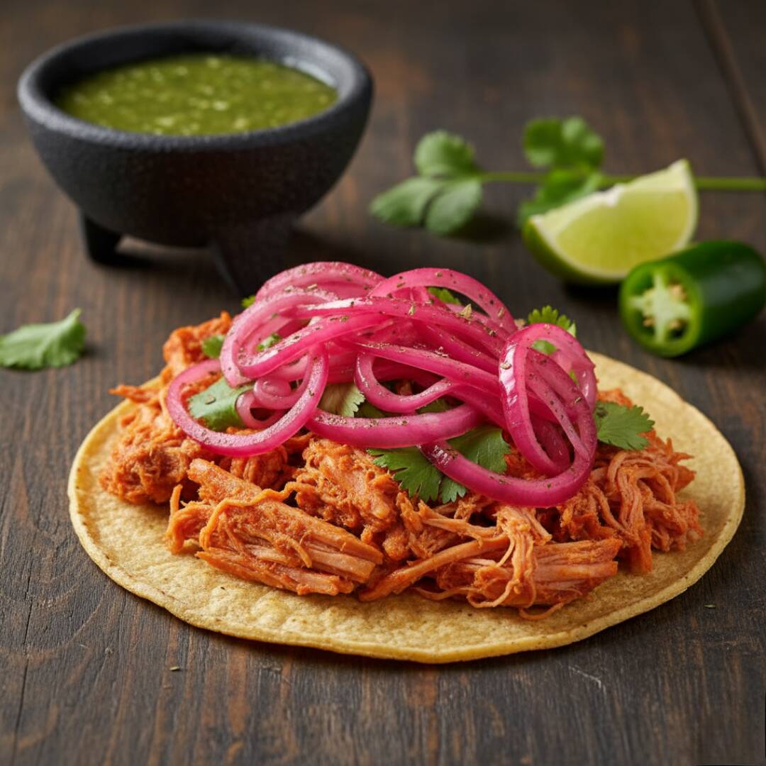 Deliciosa carne de Cerdo en trozos pequeños adobada, cebolla, cilantro y salsa de la casa