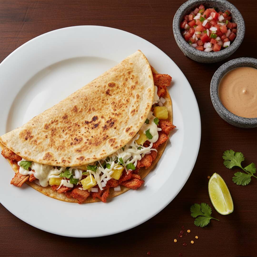 Tortilla de trigo a la plancha rellena con queso mozzarrella, Cerdo al Pastor, pico de gallo, acompañado de guacomole y crema agria