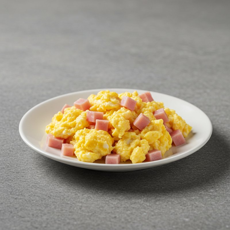 Sandwich de croissant con huevo revuelto, jamón y queso.