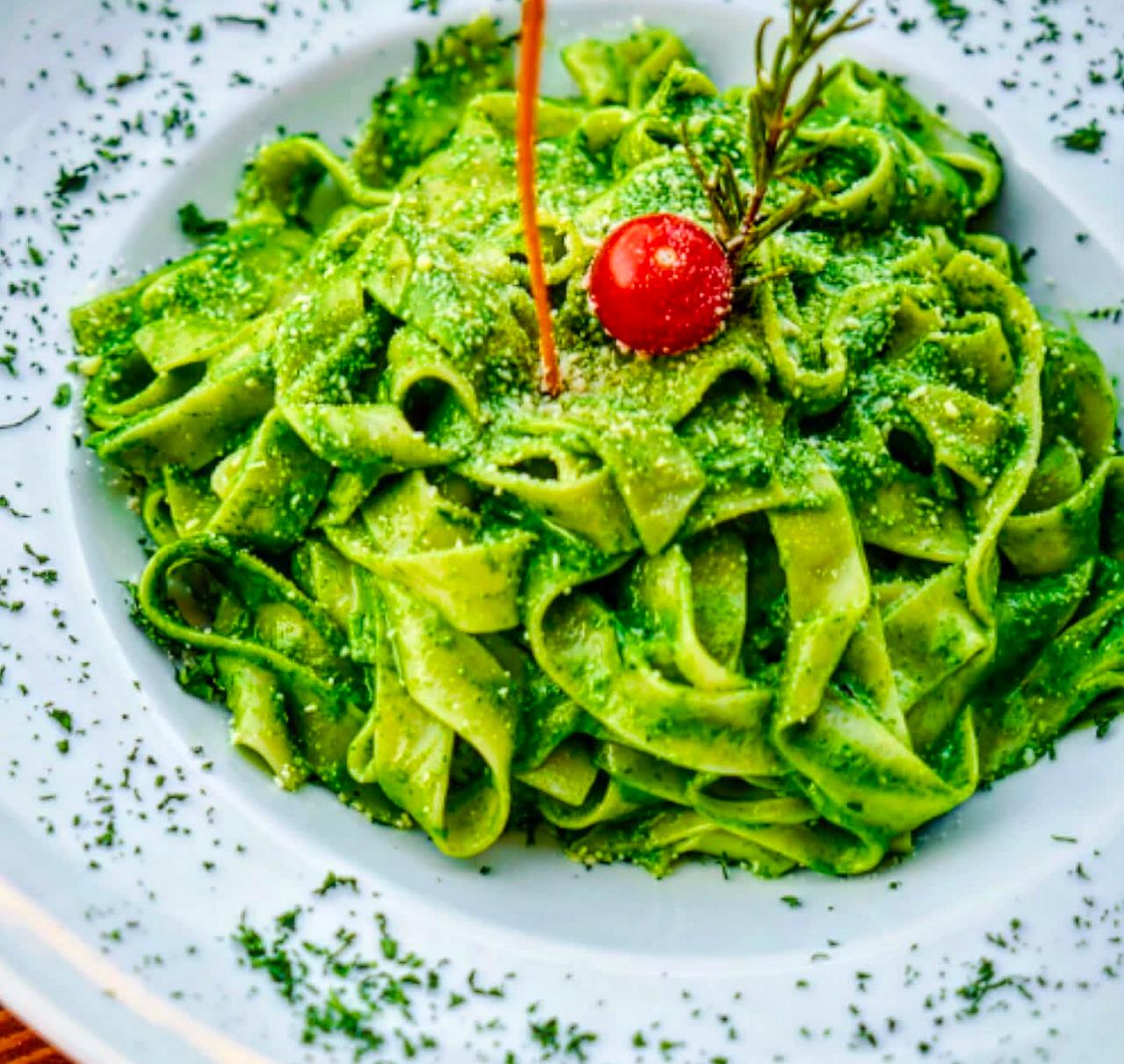 fetuccini fresco elaborado a mano salteado con un delicioso pesto y tomatitos marinados. acompañado de slizes de pan al graten.