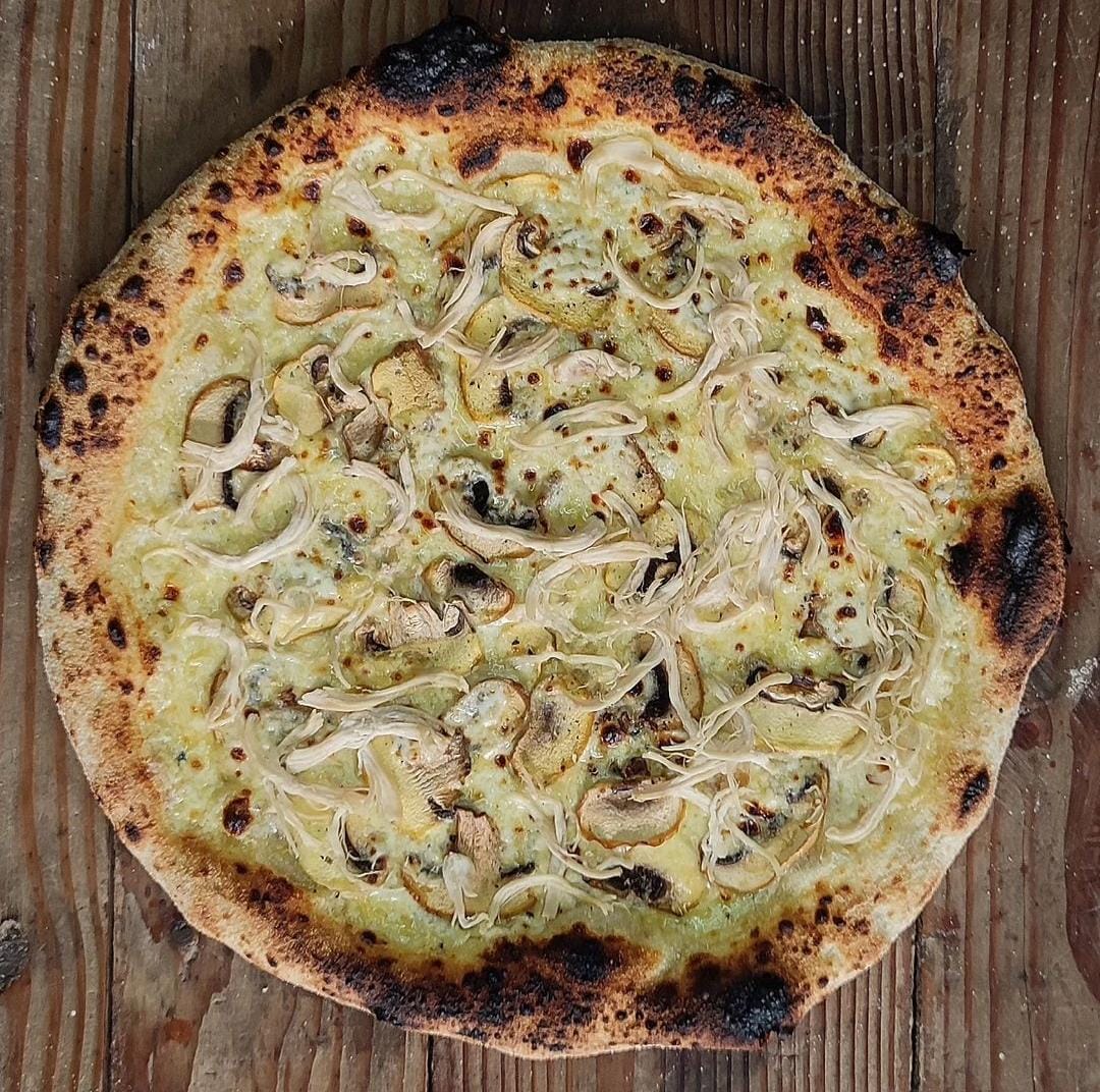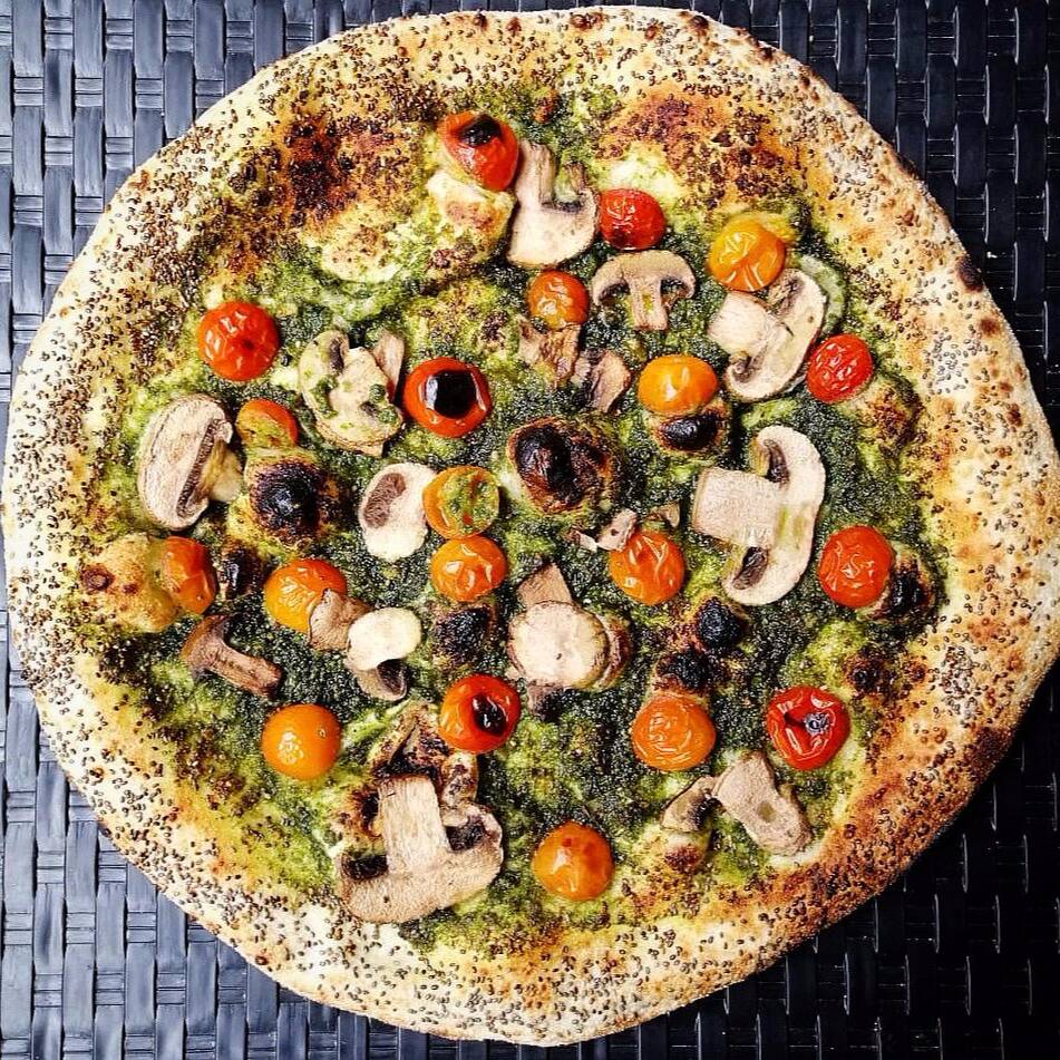 Masa artesanal, salsa pesto original, tomaticos macerados horneados, champiñones frescos, borde de chia y ajonjoli.