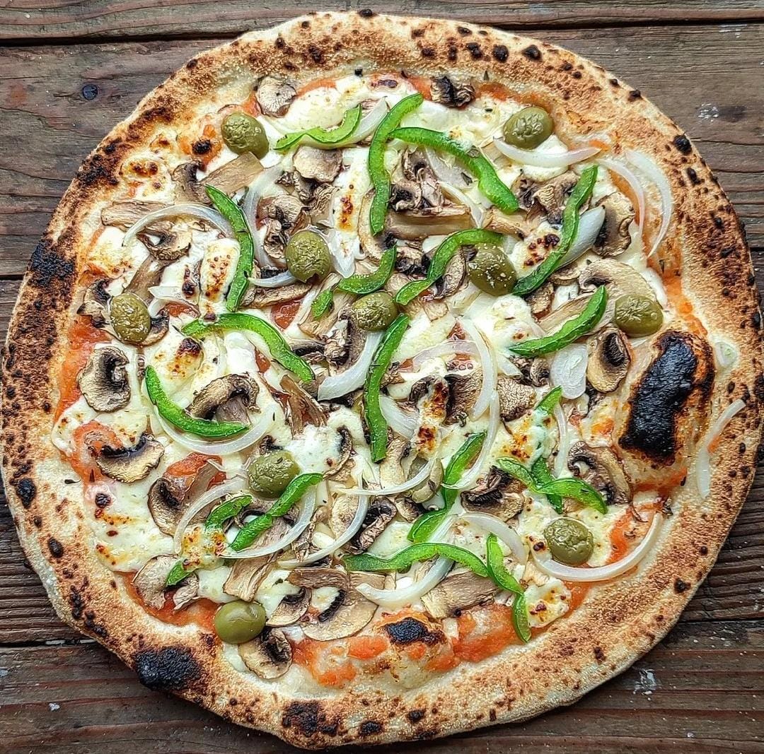 masa artesanal, salsa napolitana, queso mozarella, pimenton asado, cebolla, champiñon, aceitunas
