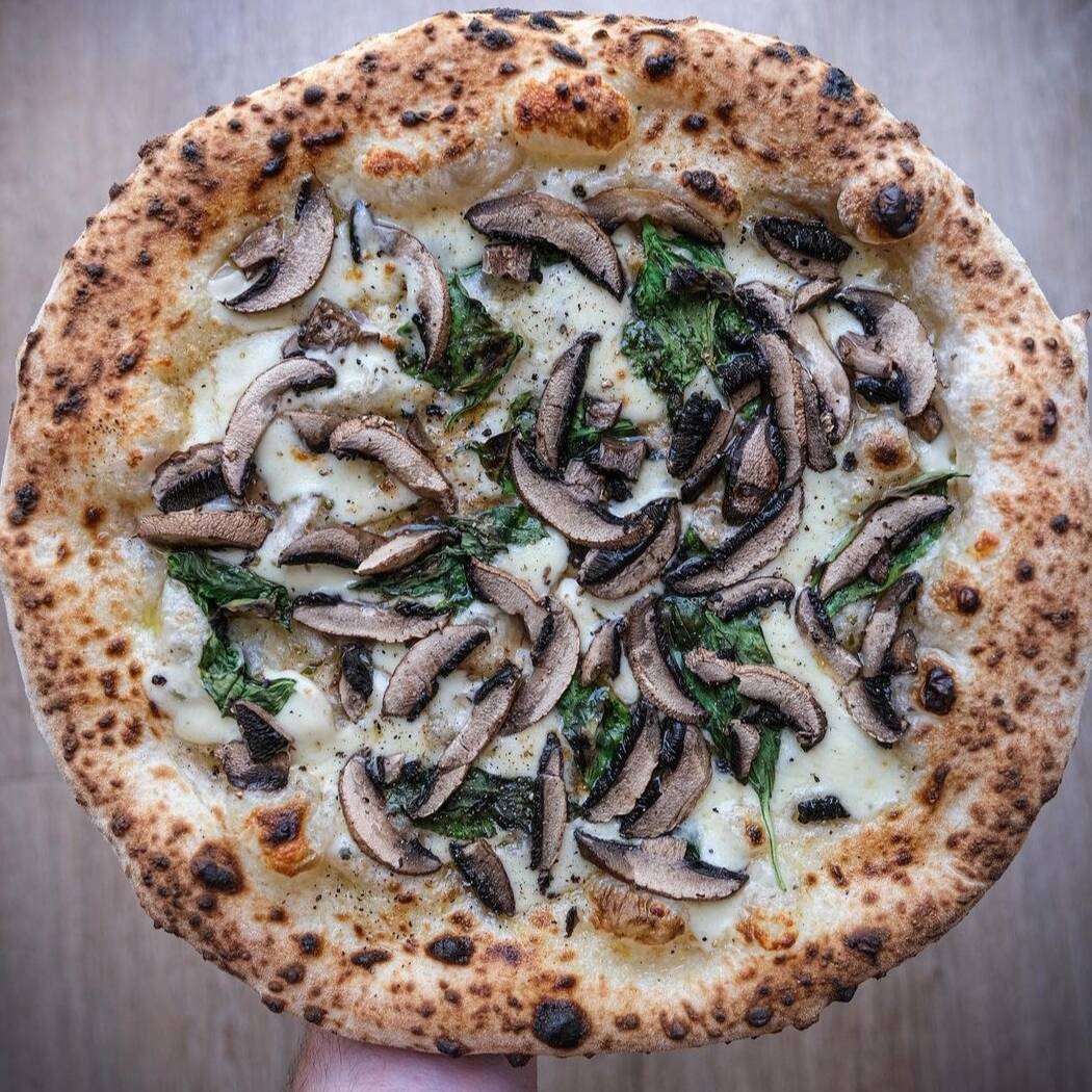 Masa artesanal, salsa de quesos fundidos, albahaca fresca, queso mozarella, champiñones salvajes, hiervas del bosque.