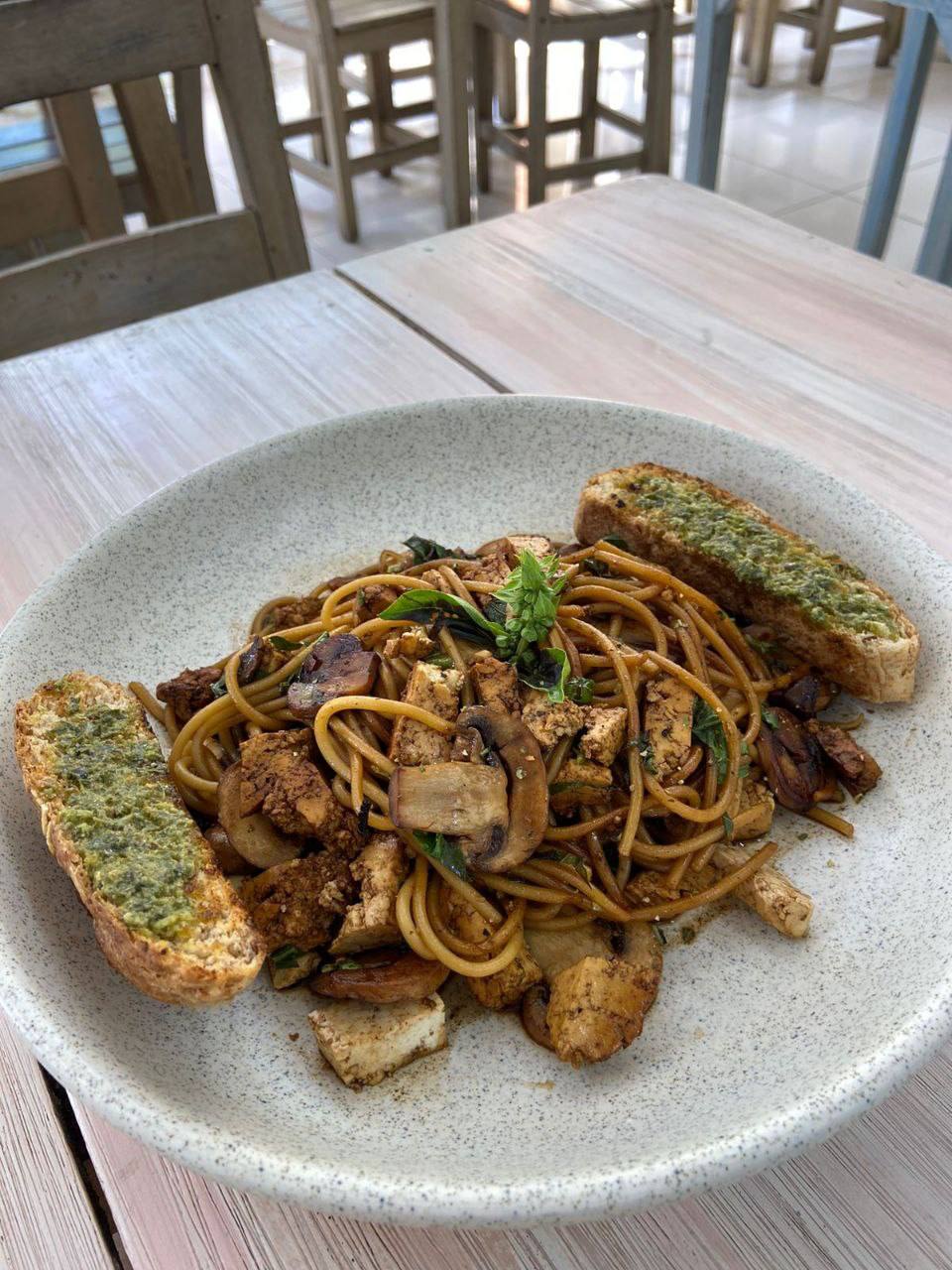 Espagueti en salsa de soya, champiñones salteados, crutones de tofu, 2 rodajas de pan integral con pesto, guandolo con flor de Jamaica o jugo natural en agua.