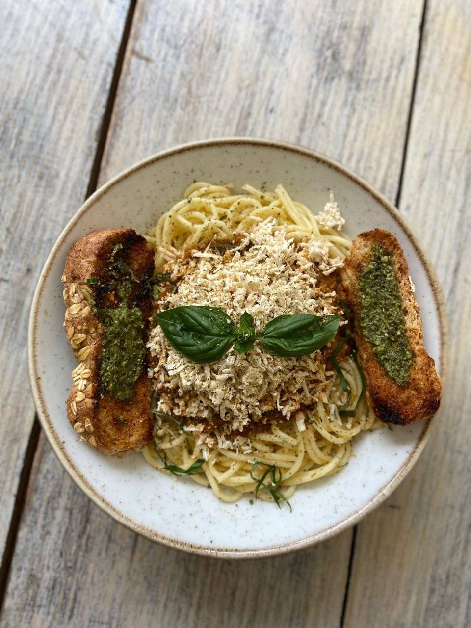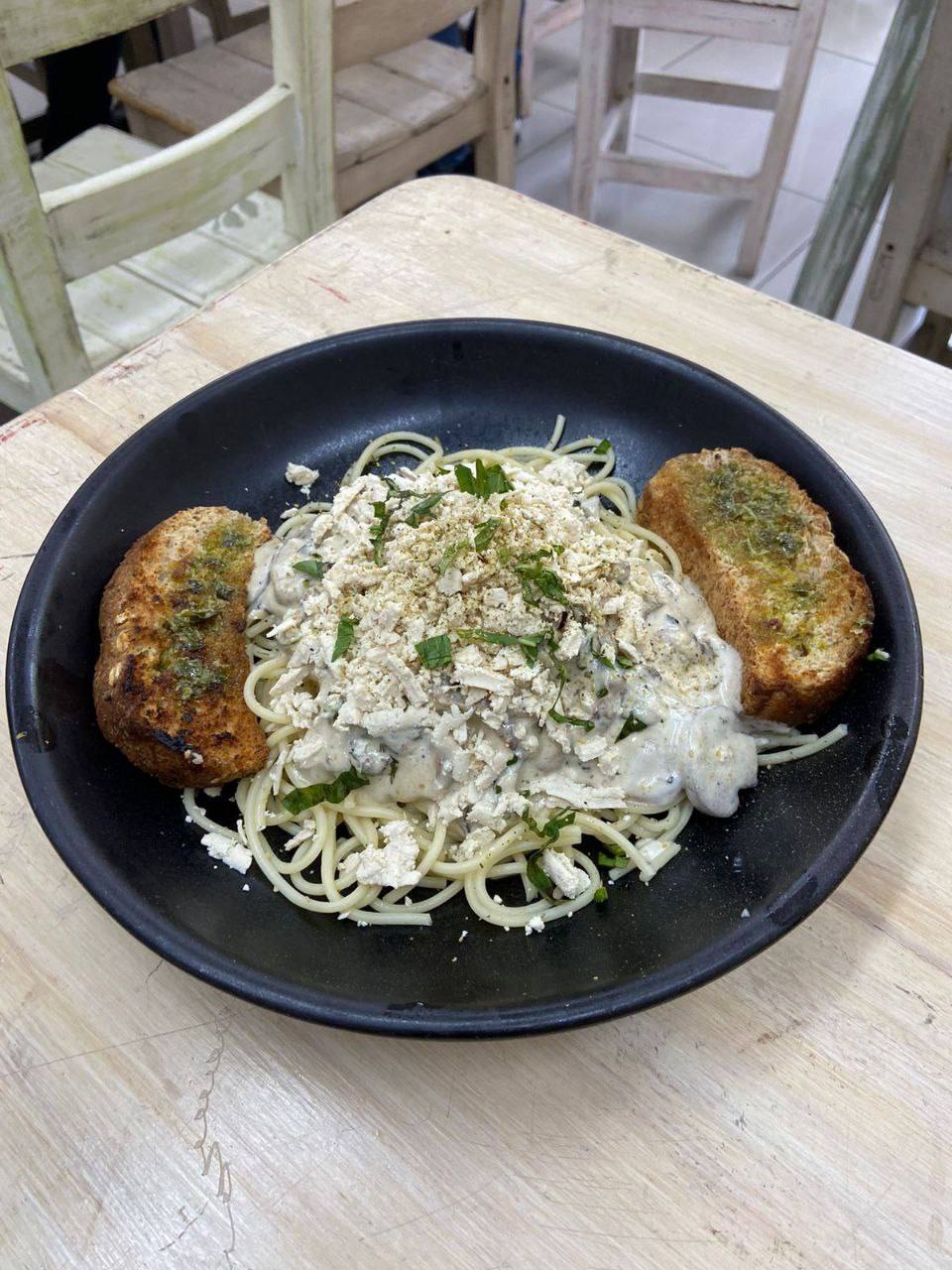 Espagueti con salsa blanca tipo bechamel vegana, champiñones al ajillo, tofu rayado, 2 rodajas de pan integral con pesto, guandolo con flor de Jamaica o jugo natural en agua.