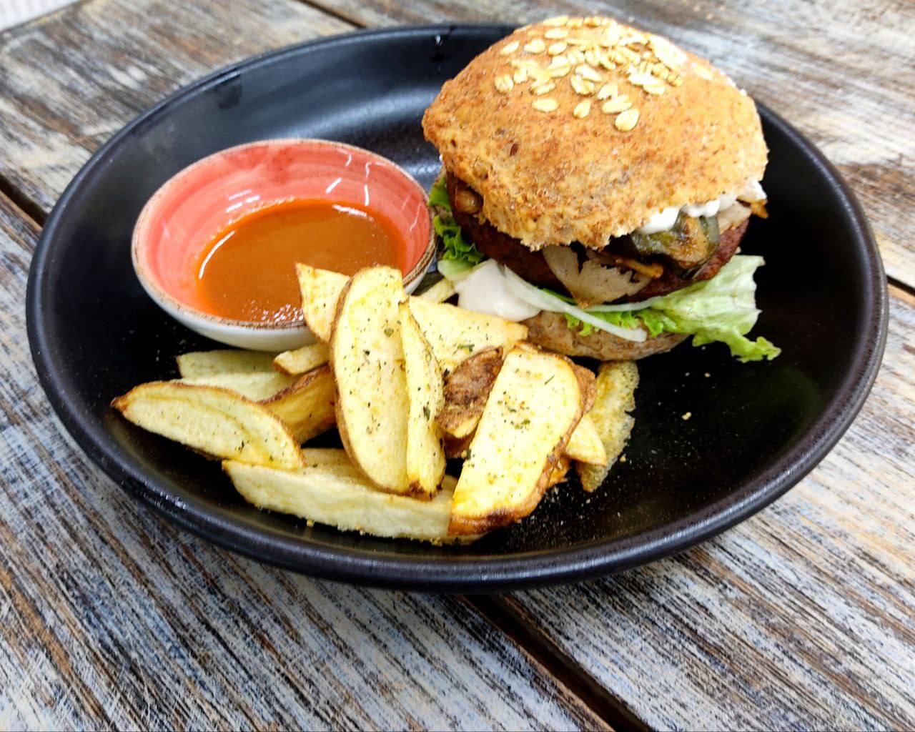 Pan artesanal integral con avena, proteína a base de lentejas o garbanzos con amaranto, lechuga crespa, tomate milano, cebolla cruda y pepino caramelizado, champiñones salteados, queso en lonchas vegano, alioli, mayonesa con ajo vegana, papas fritas en cascos, sazón veggie y salsa de tomate, ,inclu