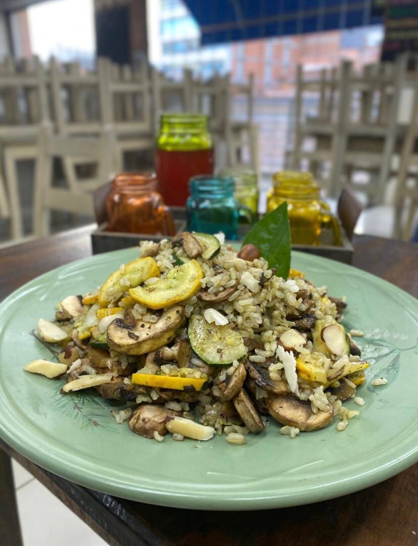 Arroz integral con pesto, variedad de vegetales, champiñones salteados, tofu y roció de nueces, guandolo con flor de Jamaica o jugo natural en agua.