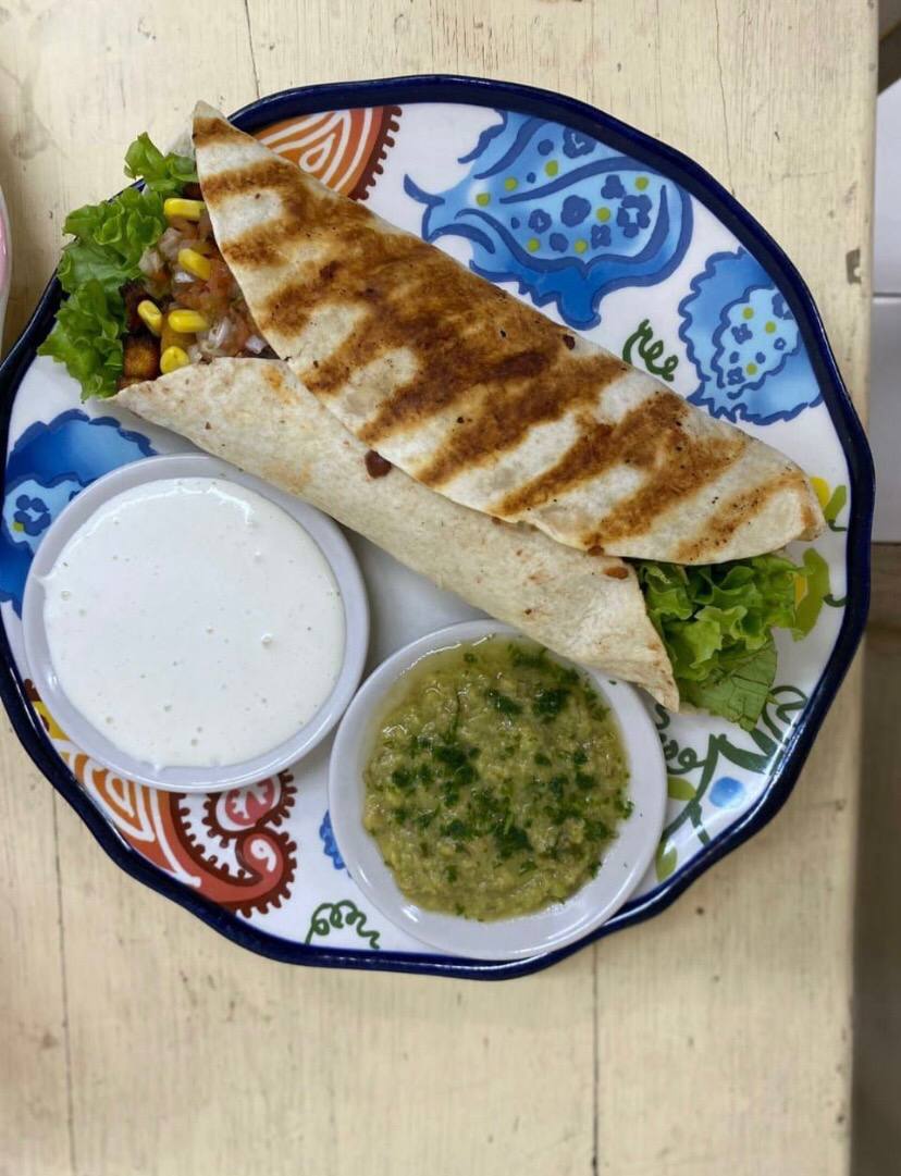 Maldito de lentejas y frijol refrito, lechuga crespa, pico de gallo, maicitos, crutones de plátano maduro, queso en lonchas vegano, alioli, mayonesa con ajo vegana y guacamole, guandolo con flor de Jamaica o jugo natural en agua.