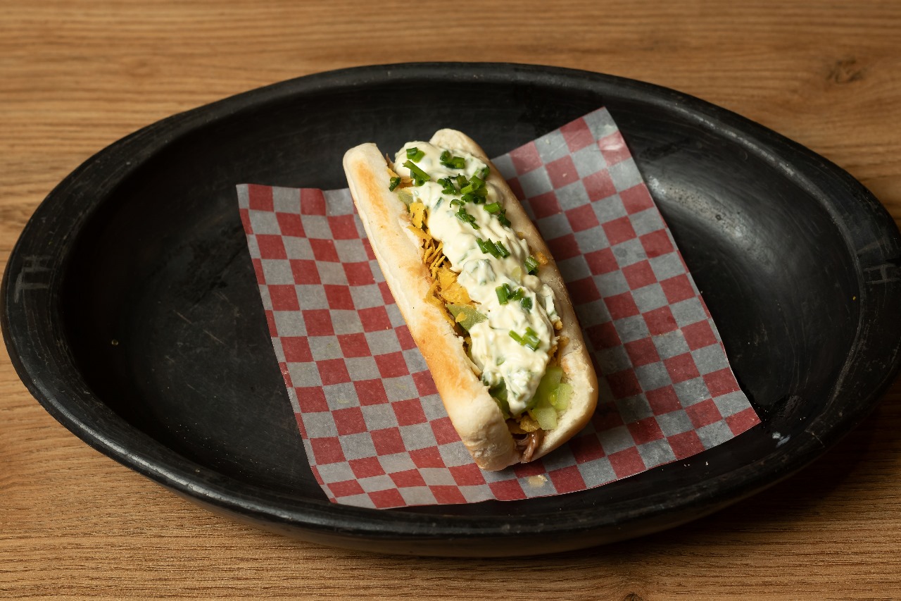 Queso crema, salchicha, chimichurri, mostaza, y cebolla puerro