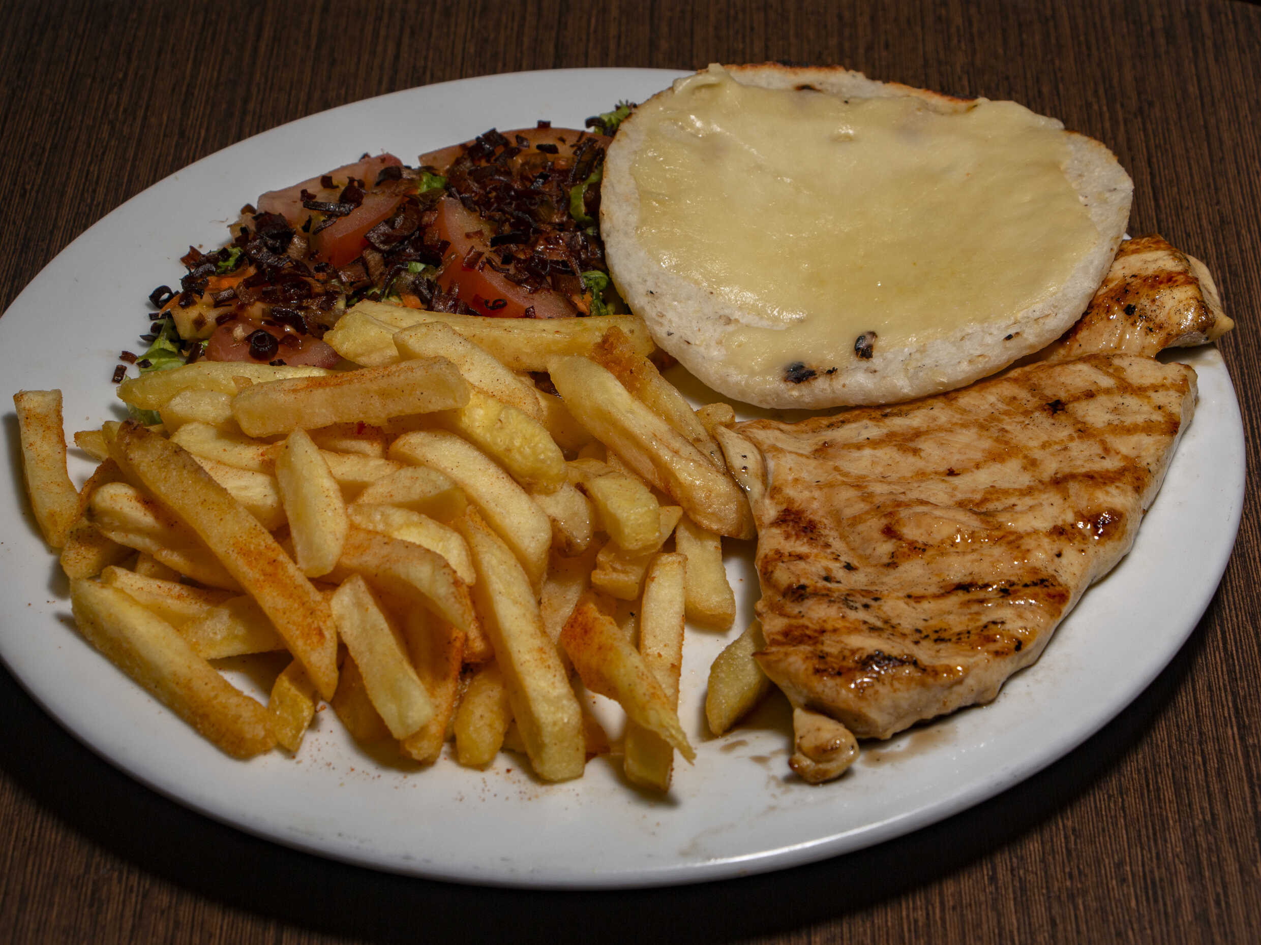 Filete de pechuga pollo 200 g con papas a la francesa, ensalada de lechuga, tomate, zanahoria en julianas, vinagreta.
