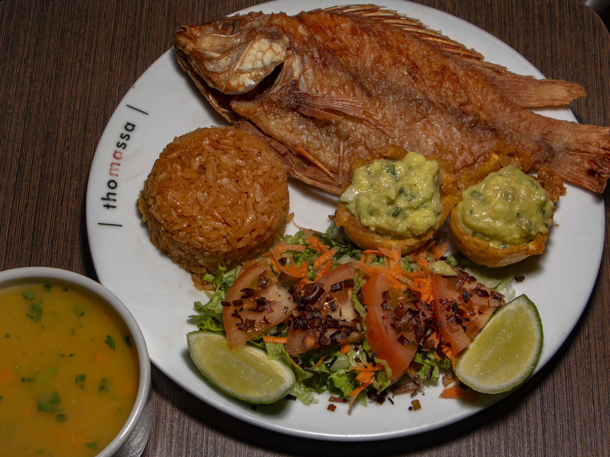 tilapia 280 grs canastas de patacon con guacamole,arroz con coco, ensalada balsamico