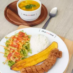 Entrada, proteína de (pollo, cerdo o chicharrón), ensalada, arroz y acompañamiento a elección.