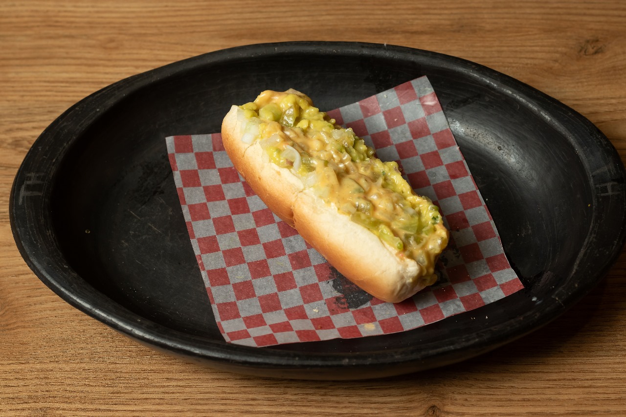 salchicha, guacamole, tomate verde, cebolla, salsa de la casa