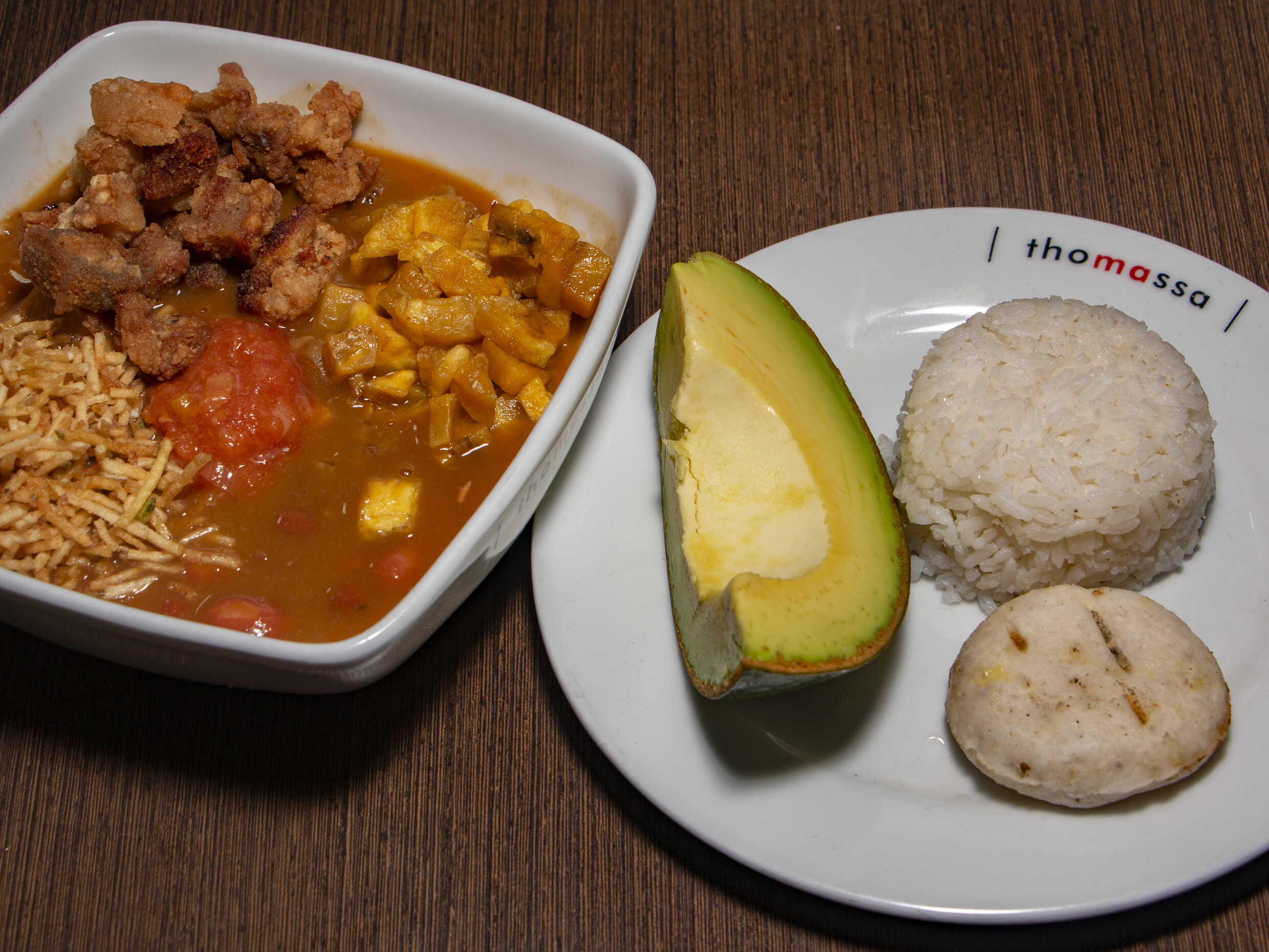 Acompañado con carne desmechada, frijol negro, madurito y aguacate en cubos.